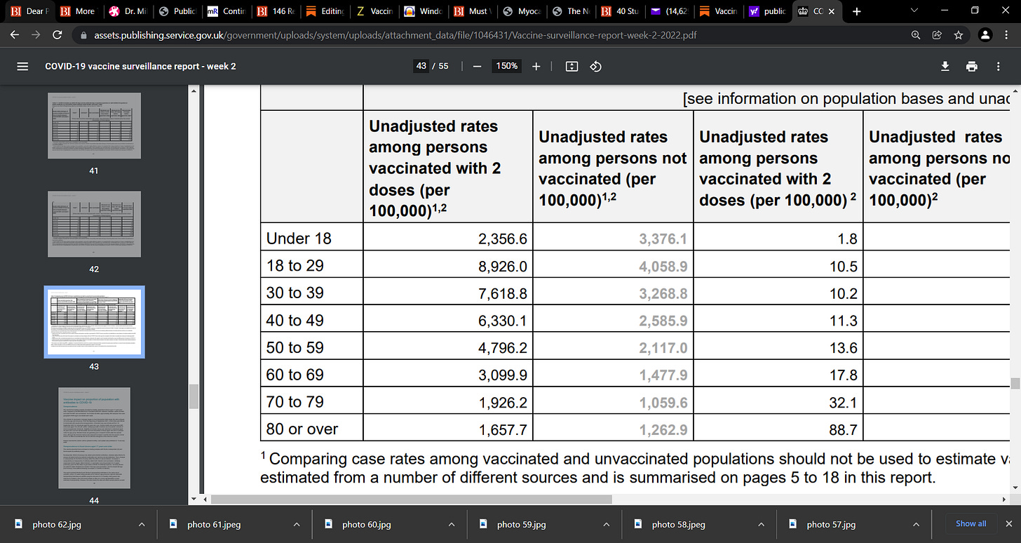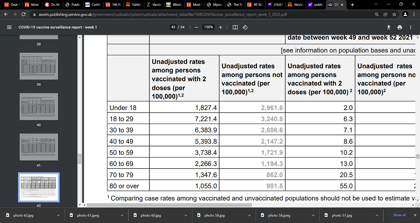 It is clear from above tables (unadjusted) that the vaccinated is being infected at far greater levels than the unvaccinated. Except < 18 years old. This is disastrous as the rates are increasing week over week. We have to urgently study the extent that they can transmit to both vaccinated and unvaccinated persons, and how much they can get sick. But we must stop the vaccine. It is time to end the pandemic, it is time to end this vaccine, it does not work and is harmful.