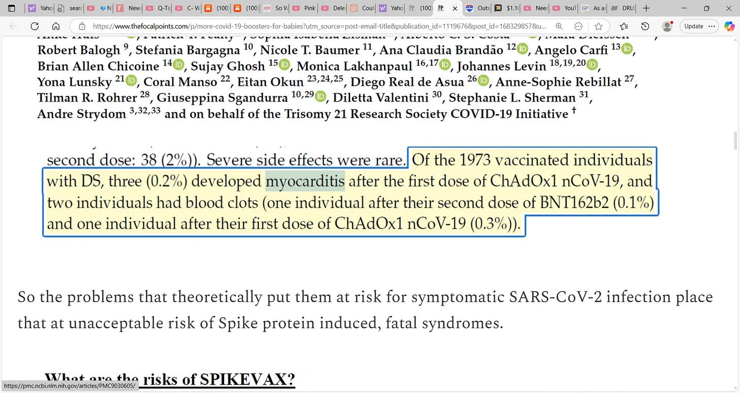 Babies even with medical problems are not an appropriate population for mRNA COVID-19 boosters. For example a Down’s Syndrome child with congenital heart disease would be at high risk for clinically manifest vaccine myopericarditis leading to heart failure or cardiac arrest. Huls et al captured three cases of myocarditis in a report on vaccination of Down’s syndrome children. No long-term outcomes are disclosed. Heart disease is a major cause of death in Downs and we would not want any medication or vaccine to accentuate this risk.