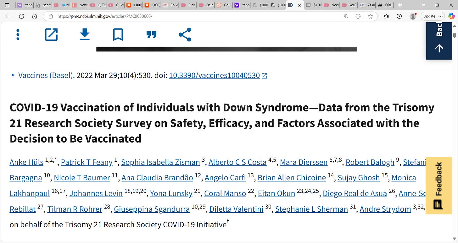 Hüls A, Feany PT, Zisman SI, Costa ACS, Dierssen M, Balogh R, Bargagna S, Baumer NT, Brandão AC, Carfi A, Chicoine BA, Ghosh S, Lakhanpaul M, Levin J, Lunsky Y, Manso C, Okun E, Real de Asua D, Rebillat AS, Rohrer TR, Sgandurra G, Valentini D, Sherman SL, Strydom A, On Behalf Of The Trisomy Research Society Covid-Initiative. COVID-19 Vaccination of Individuals with Down Syndrome-Data from the Trisomy 21 Research Society Survey on Safety, Efficacy, and Factors Associated with the Decision to Be Vaccinated. Vaccines (Basel). 2022 Mar 29;10(4):530. doi: 10.3390/vaccines10040530. PMID: 35455279; PMCID: PMC9030605.