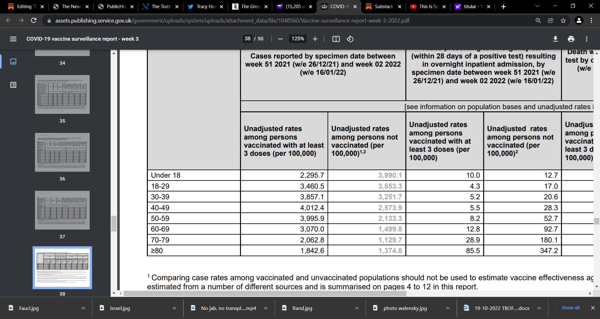 We use the raw numbers and rates from last week’s report to derive the total number of double and triple vaccinated, and the rates in this week’s report to derive the triple vaccinated population, leaving us with a decent estimate of the size of the double but not triple vaccinated population in each age bracket. I have accepted this modelling and data and we will discuss based on this as I have full confidence in Eugyppius’s work: