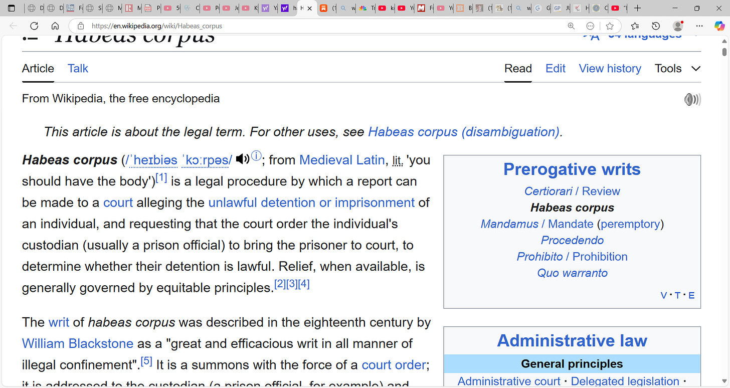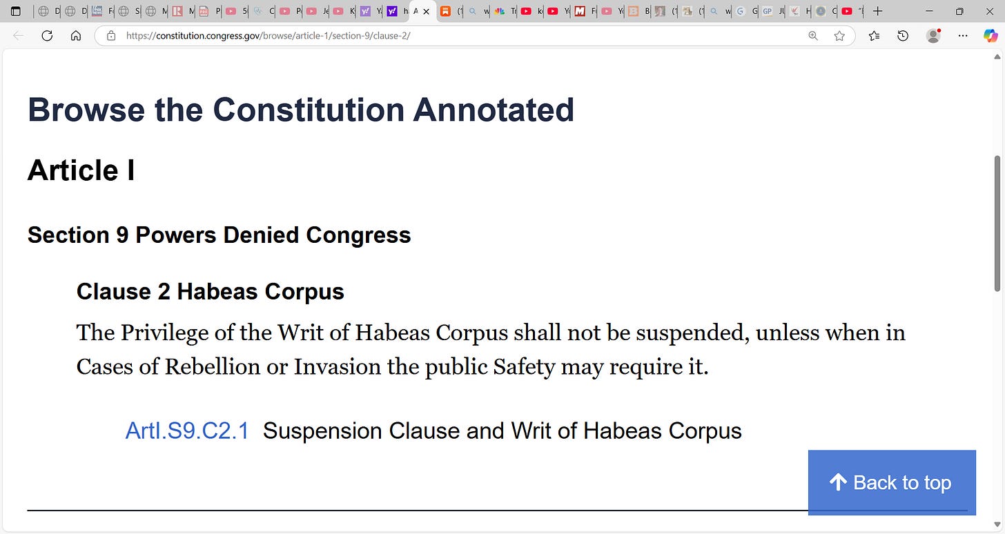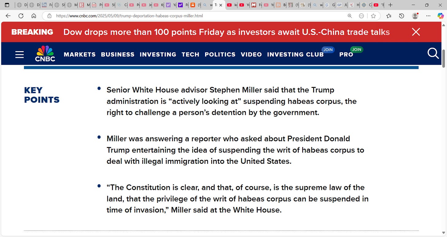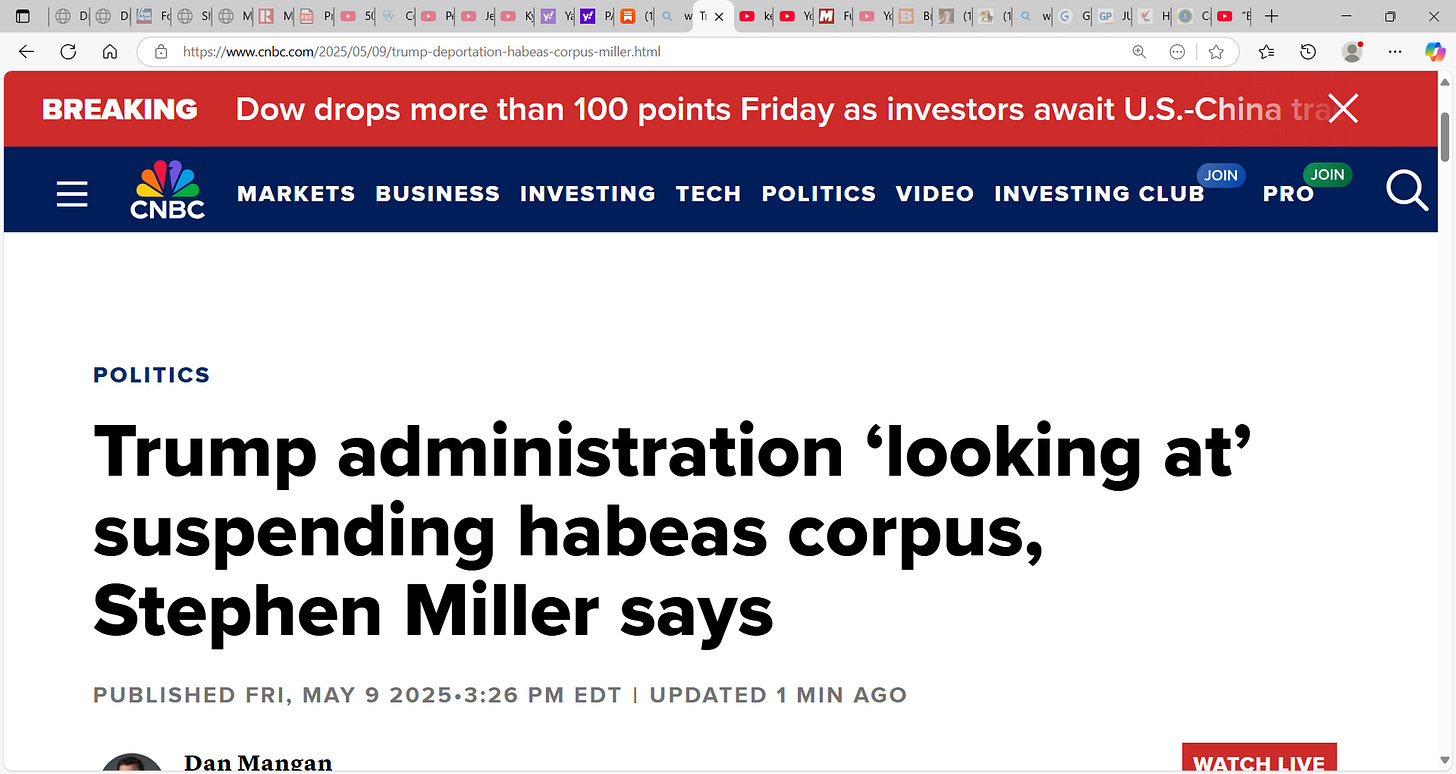 Are we there? Should judges stop constraining POTUS Trump’s move to deport, and should judges in terms of undocumented immigrants block POTUS Trump where those people are exercising rights via habeas writs? What say you? Did the Immigration and Nationality Act (INA I think 1965??) via congress remove federal courts of any jurisdiction over immigration cases? What say you? Suspension applies to you too. I believe it can be (if allowed) an across-the-board suspension. Are you comfortable with that? Does this situation warrant? I do think there are issues, some urgent ones too. Should POTUS Trump await SCOTUS who will rule soon (I do not know timeline) or is he better off suspending habeas and mass deporting with no constraints? Is the nation better off?