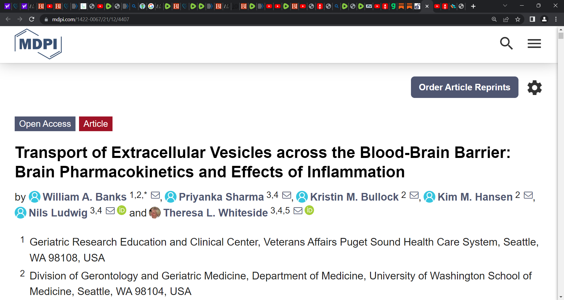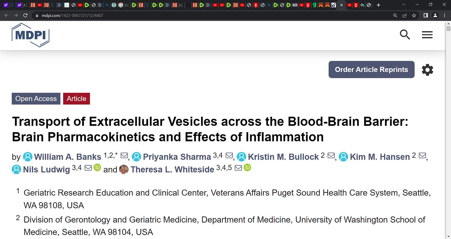 ‘Extracellular vesicles can cross the blood–brain barrier (BBB), but little is known about passage. Here, we used multiple-time regression analysis to examine the ability of 10 exosome populations derived from mouse, human, cancerous, and non-cancerous cell lines to cross the BBB. All crossed the BBB, but rates varied over 10-fold. Lipopolysaccharide (LPS), an activator of the innate immune system, enhanced uptake independently of BBB disruption for six exosomes and decreased uptake for one.’