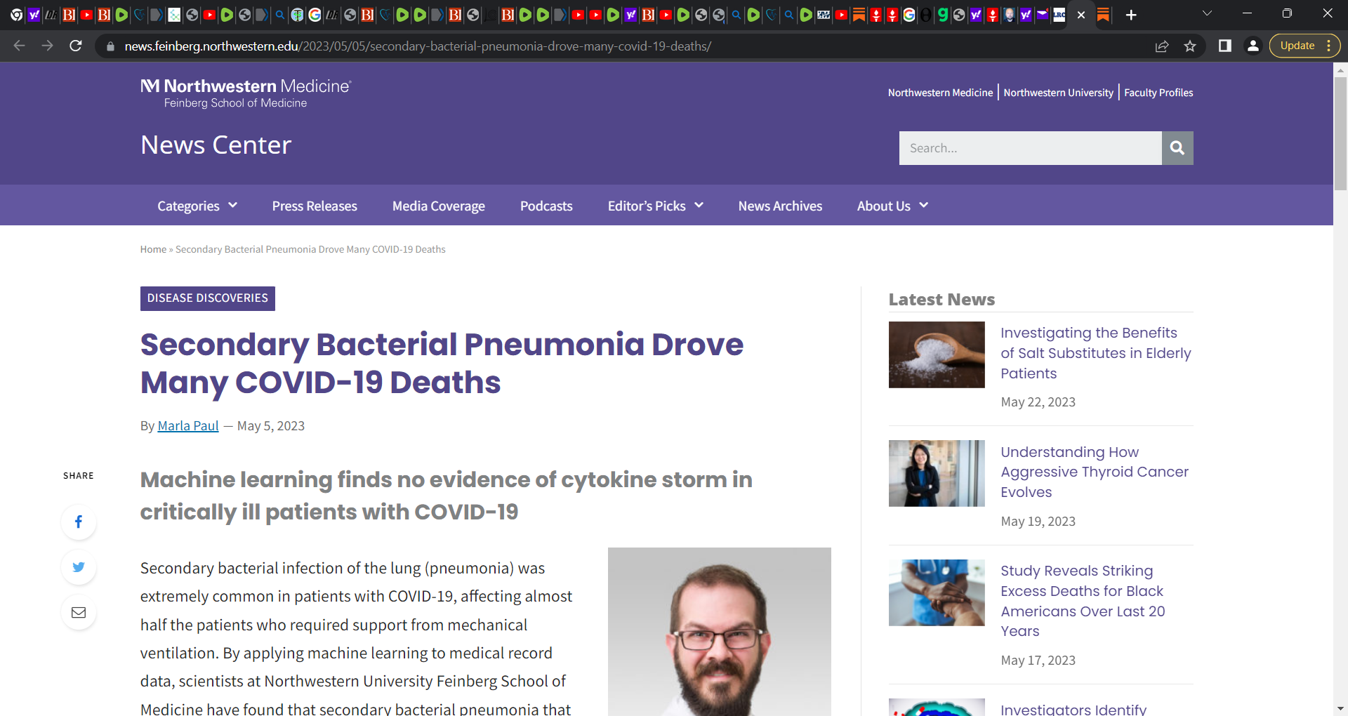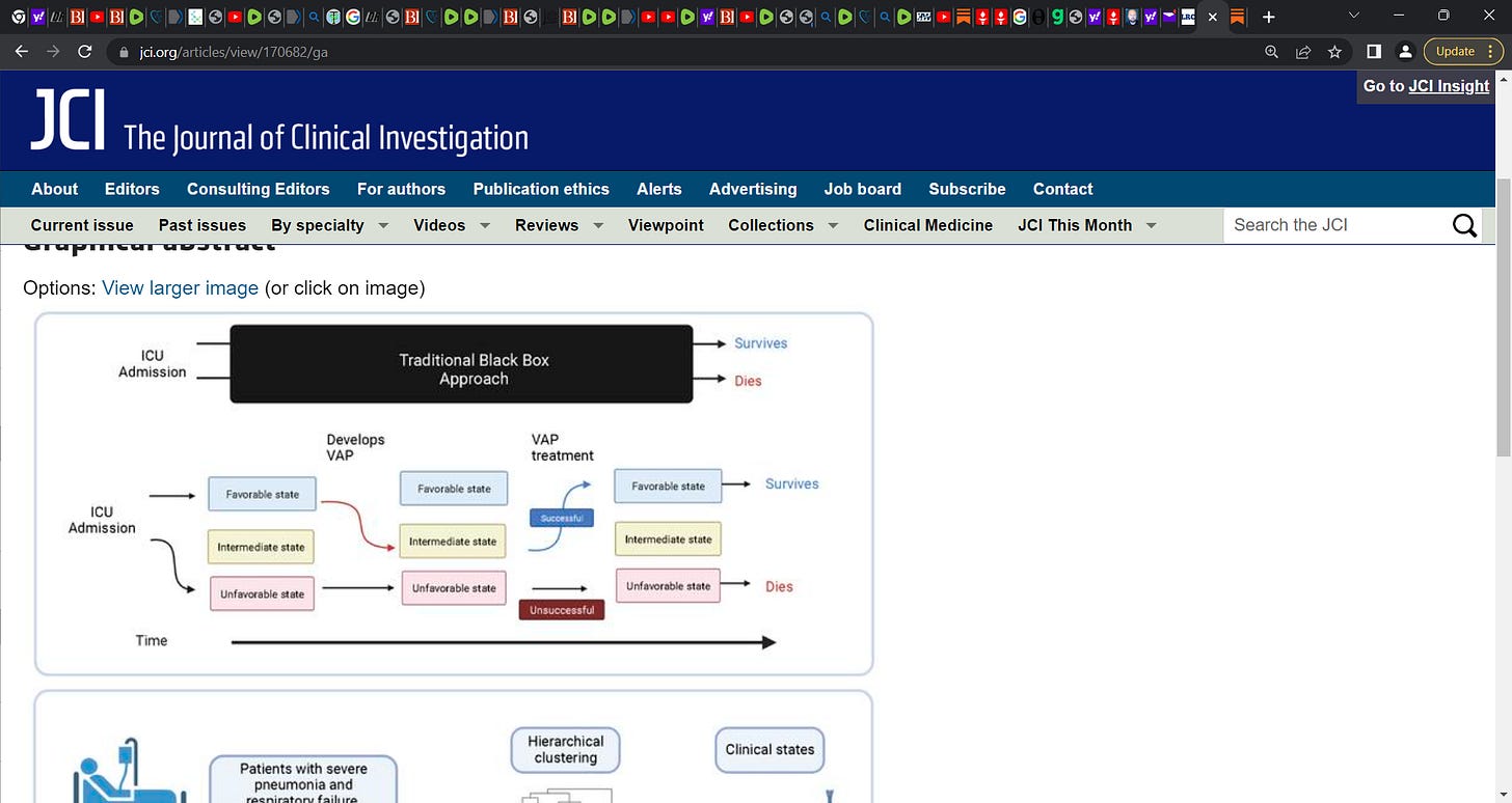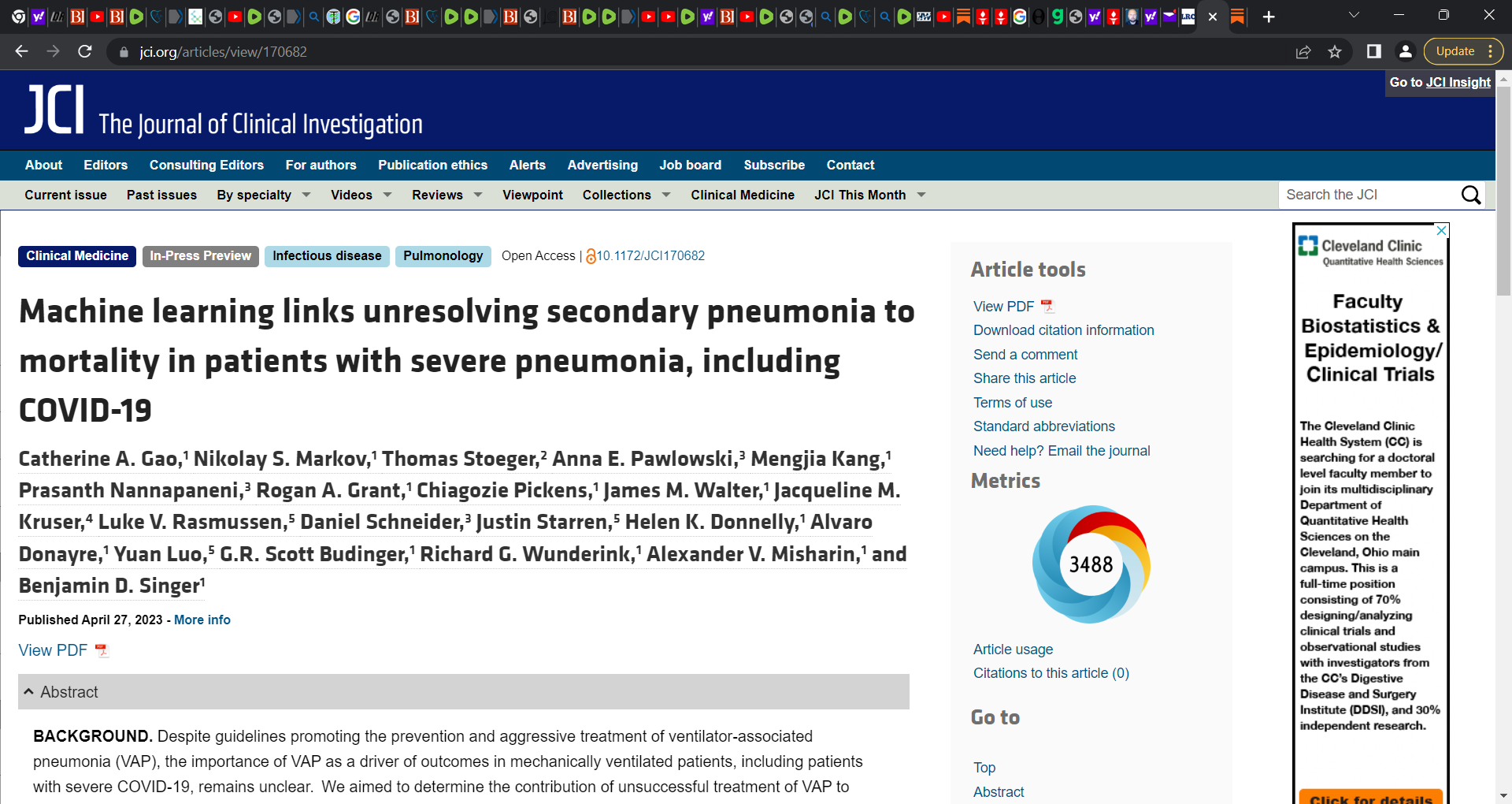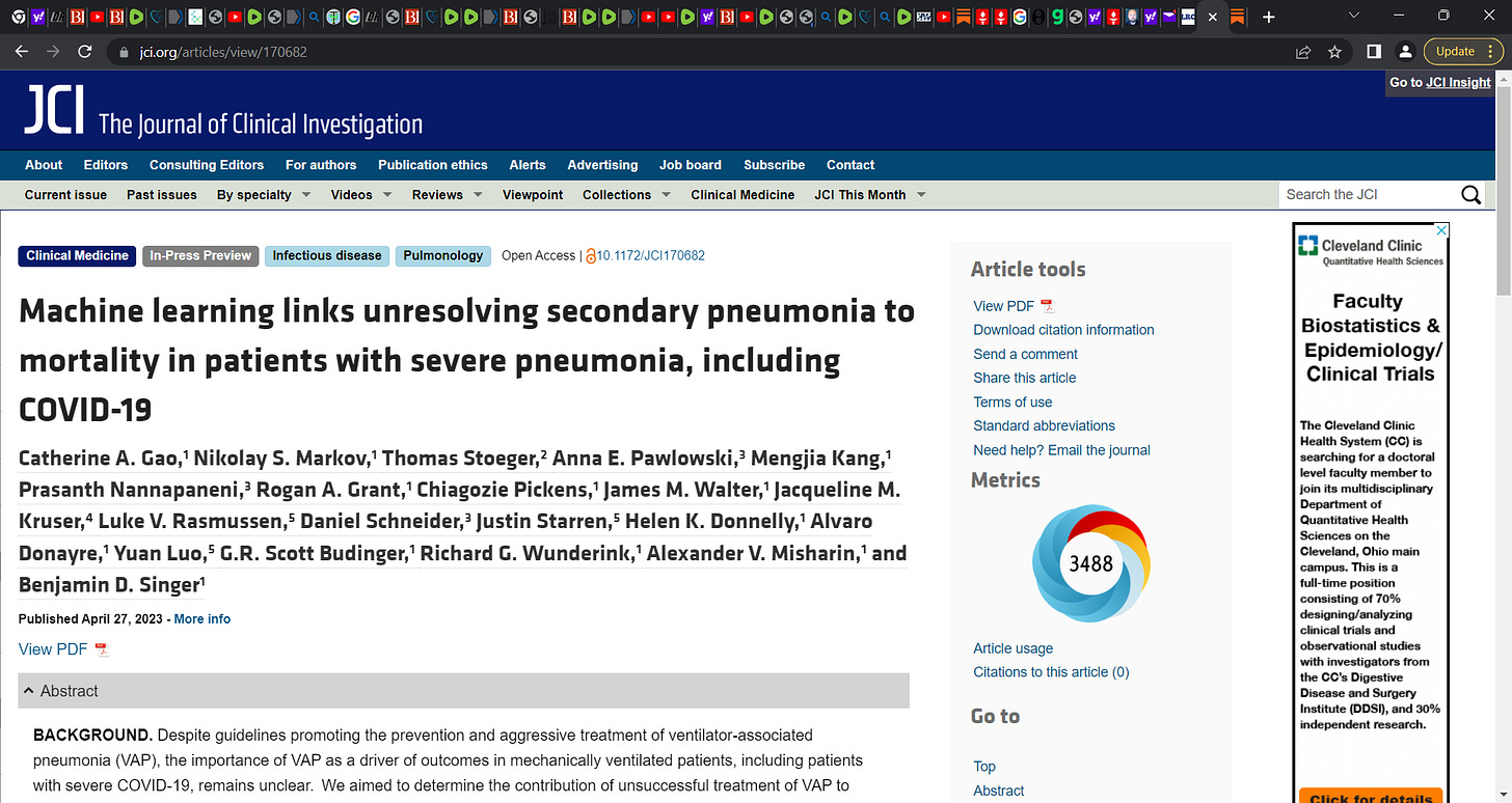 ‘METHODS. We performed a single-center prospective cohort study of 585 mechanically ventilated patients with severe pneumonia and respiratory failure, 190 of whom had COVID-19, who underwent at least one bronchoalveolar lavage. A panel of ICU physicians adjudicated pneumonia episodes and endpoints based on clinical and microbiologic data. Given the relatively long ICU length of stay among patients with COVID-19, we developed a machine learning approach called CarpeDiem, which groups similar ICU patient-days into clinical states based on electronic health record data.
