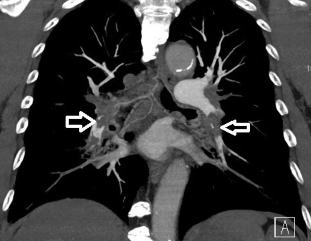 Bilateral pulmonary embolism noted on computed tomography angiography (white open arrows).