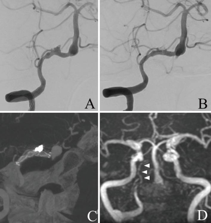 (A) Frontal view of the right vertebral artery angiography (VAG) before internal trapping shows dissecting aneurysm in the right VA. (B) Frontal view of the right VAG after internal trapping reveals that the dissecting lesion was occluded just distal to the origin of the right posterior inferior cerebellar artery (PICA). (C) Frontal view of the left VAG after internal trapping also reveals that the dissecting lesion was occluded. (D) Postoperative magnetic resonance angiography (MRA) performed 2 weeks after treatment reveals that the dissecting lesion of the right VA was not visualized.
