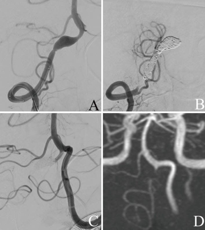 (A) Frontal view of the right vertebral artery angiography (VAG) before stent-assisted coil embolization shows dissecting aneurysm in the right vertebral artery (VA) involving the right posterior inferior cerebellar artery (PICA). (B) Frontal view of the right VAG after stent-assisted coil embolization shows coil occlusion of the aneurysmal sac and patency of the right VA and right PICA. (C) Cone beam computed tomography (CT) image shows the bladed stent placed across the dissecting lesion and coils deployed into the sac. (D) Postoperative magnetic resonance angiography (MRA) performed 2 weeks after treatment shows that the dissecting aneurysm is not visualized and the right PICA is patent.