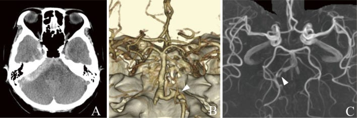 (A) Head computed tomography (CT) performed 7 days after vaccination shows massive subarachnoid hemorrhage in the posterior cranial fossa. (B) Three-dimensional CT angiography (3DCTA) performed on the same day shows a dissecting aneurysm with bleb-like protrusion on the right vertebral artery (VA). (C) Magnetic resonance angiography (MRA) performed 1 year previously shows caliber change of the right VA, retrospectively, suggesting chronic arterial dissection.