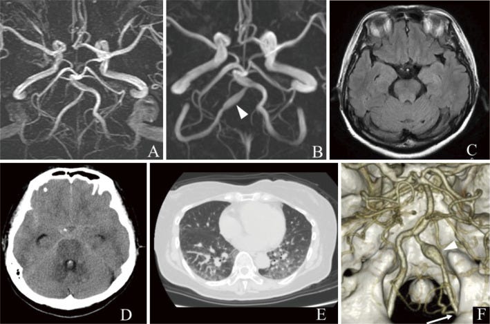 (A) Magnetic resonance angiography (MRA) performed 10 years previously shows normal right vertebral artery (VA). (B) MRA performed 3 weeks before the vaccination shows dilatation of the right VA (arrowhead). (C) Fluid-attenuated inversion recovery magnetic resonance imaging (MRI) performed on the same day shows no intracranial hemorrhage. (D) Head computed tomography (CT) performed 1 day after the vaccination shows diffuse subarachnoid hemorrhage. (E) Chest CT performed on the same day shows bilateral pulmonary effusion. (F) Three-dimensional CT angiography (3DCTA) performed on the same day shows dissecting aneurysm in the right VA (arrowhead). The right posterior inferior cerebellar artery (PICA) originated from the extradural segment of the VA (arrow).