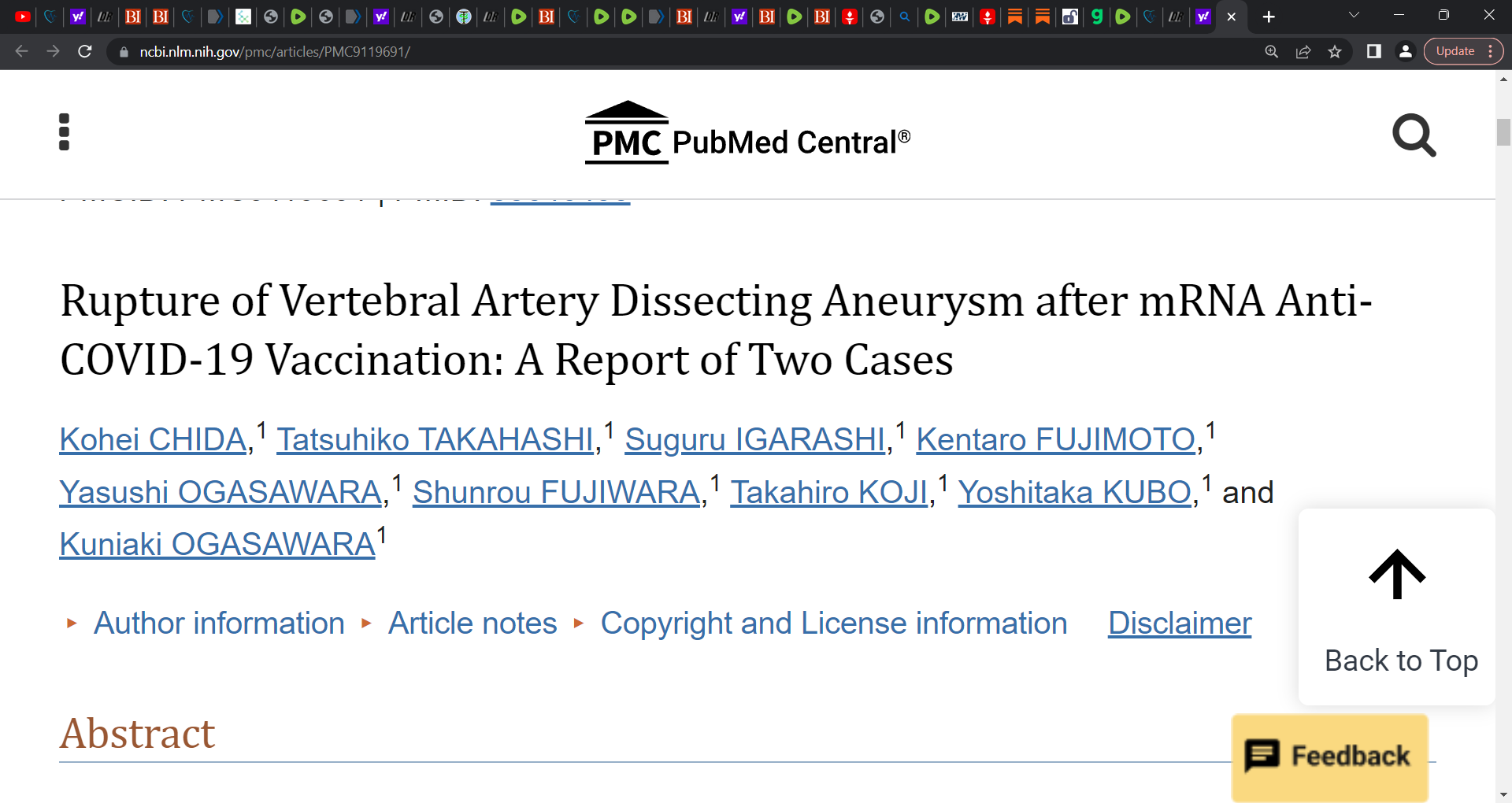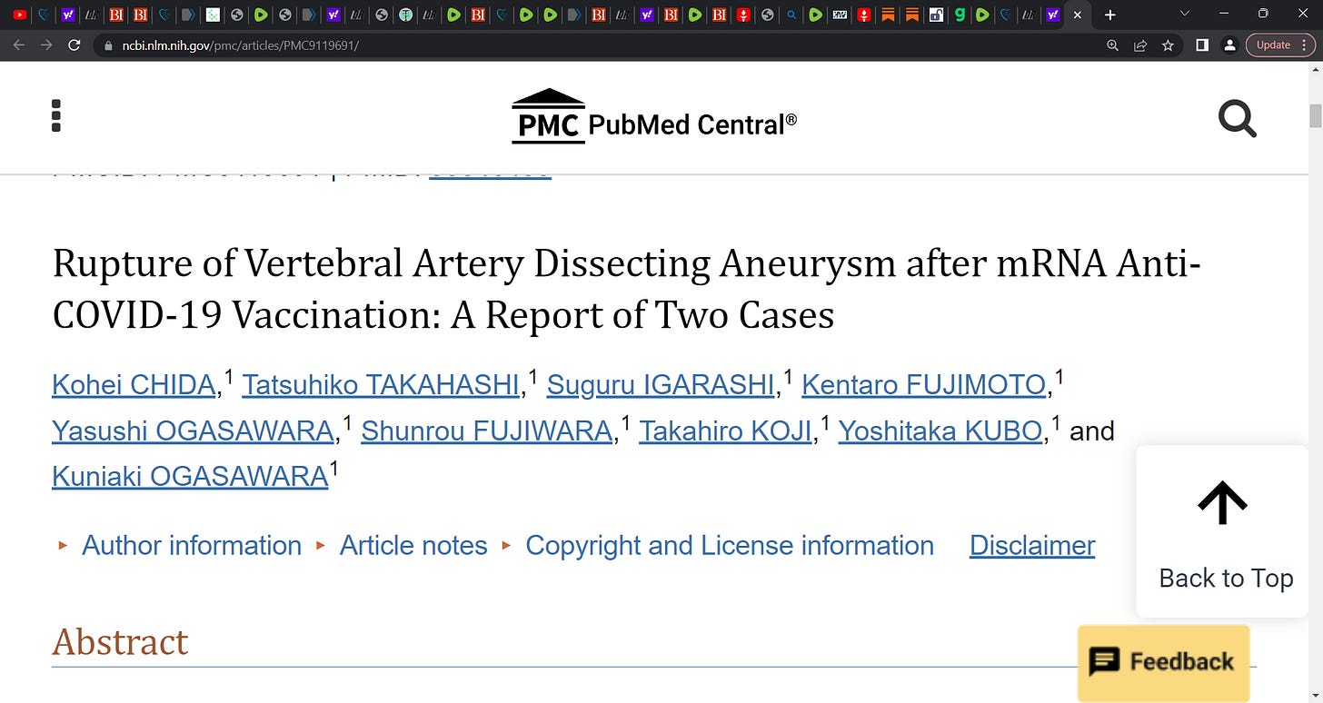 Did CHIDA et al. show us the catastrophic risk of rupture of Vertebral Artery Dissecting Aneurysm after mRNA technology based COVID gene injection vaccine (Moderna & Pfizer), looking at 2 cases? Yes!