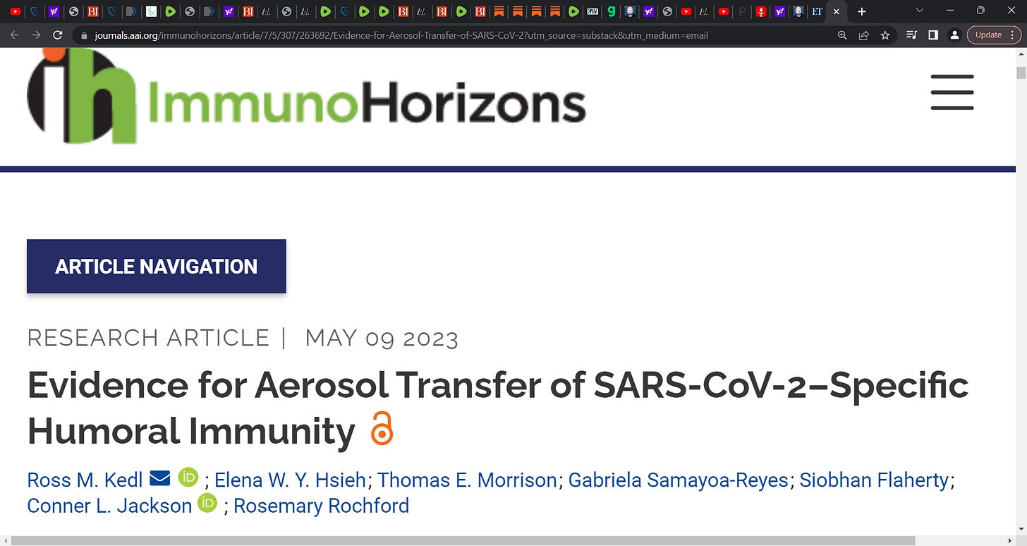 In short, the findings revealed elevated IgG in the nostrils (intranasal) of vaccinated parents that was “significantly associated” with an increase in intranasal IgG in the children who were unvaccinated and living in the same household; how do you think this happened? they also found no COVID antibodies in the nasal swabs taken from children residing in the nonvaccinated family homes. Same for IgA. IMO, this is clear aerosol transfer transmission of antibodies and I mean from virus or vaccine-induced. Parent to child. This means same for the intact spike protein (vaccine-induced), spike fragments, mRNA, micro mRNA, mRNA fragments, antibodies, lipid-nano particles (LNPs) etc.