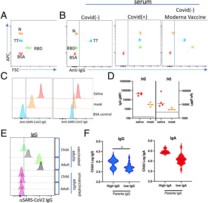 ‘(A and B) Representative flow cytometric results from the use of a multiplex microsphere immunoassay (MMI) (A) evaluating serum samples from a COVID-19–negative (B, left), COVID-19–positive (B, middle), and Moderna mRNA vaccinee (B, right). N, nucleocapsid protein; RBD, receptor-binding domain; TT, tetanus toxoid. Note that the TT reactivity serves as a positive control for validating sample quality in the assay. (C and D) Histograms showing the MFIs for Wuhan-RBD–specific IgG (left) and IgA (right) from saliva or eluted from a surgical mask worn for 1 work day. (D) Quantification of IgG and IgA gMFI eluted from masks obtained from four individuals. Dotted lines indicate gMFI obtained for COVID-19/vaccine− sample. (E) Histograms showing the MFIs for Wuhan-RBD–specific IgG eluted from nasal swabs from unvaccinated children living in households in which parents or family members were either vaccinated (top) or unvaccinated (bottom). Gray and green histograms represent histograms from two separate children in whom high (gray) versus low (green) RBD Abs were identified. (F) Log transformation of the gMFI for Wuhan-RBD–specific IgG (left) or IgA (right) from 34 adult/child pairs using Ab cutoffs for high versus low parental intranasal Ab levels. Cutoff between adult high and low samples was determined as described in Materials and Methods.’
