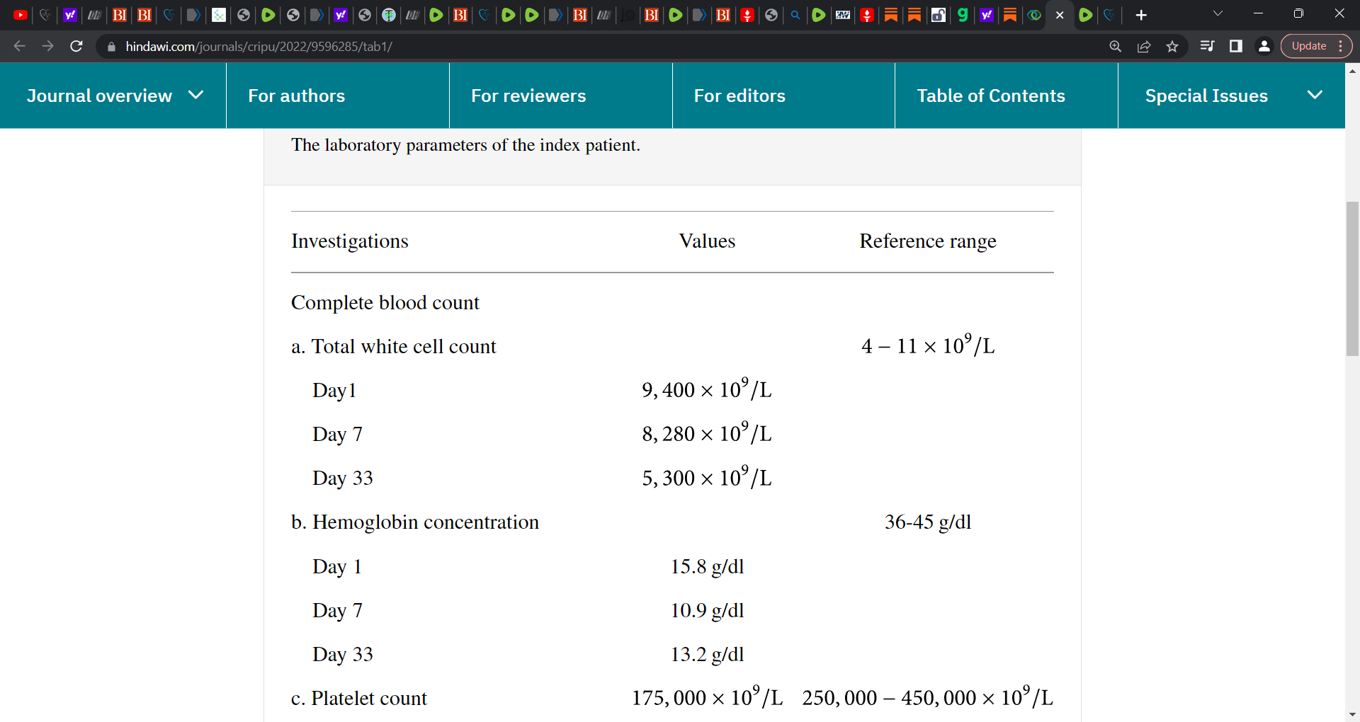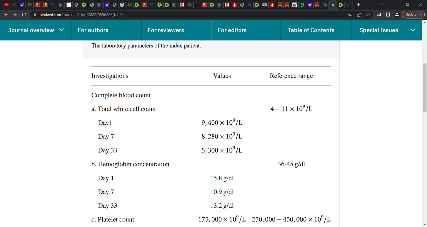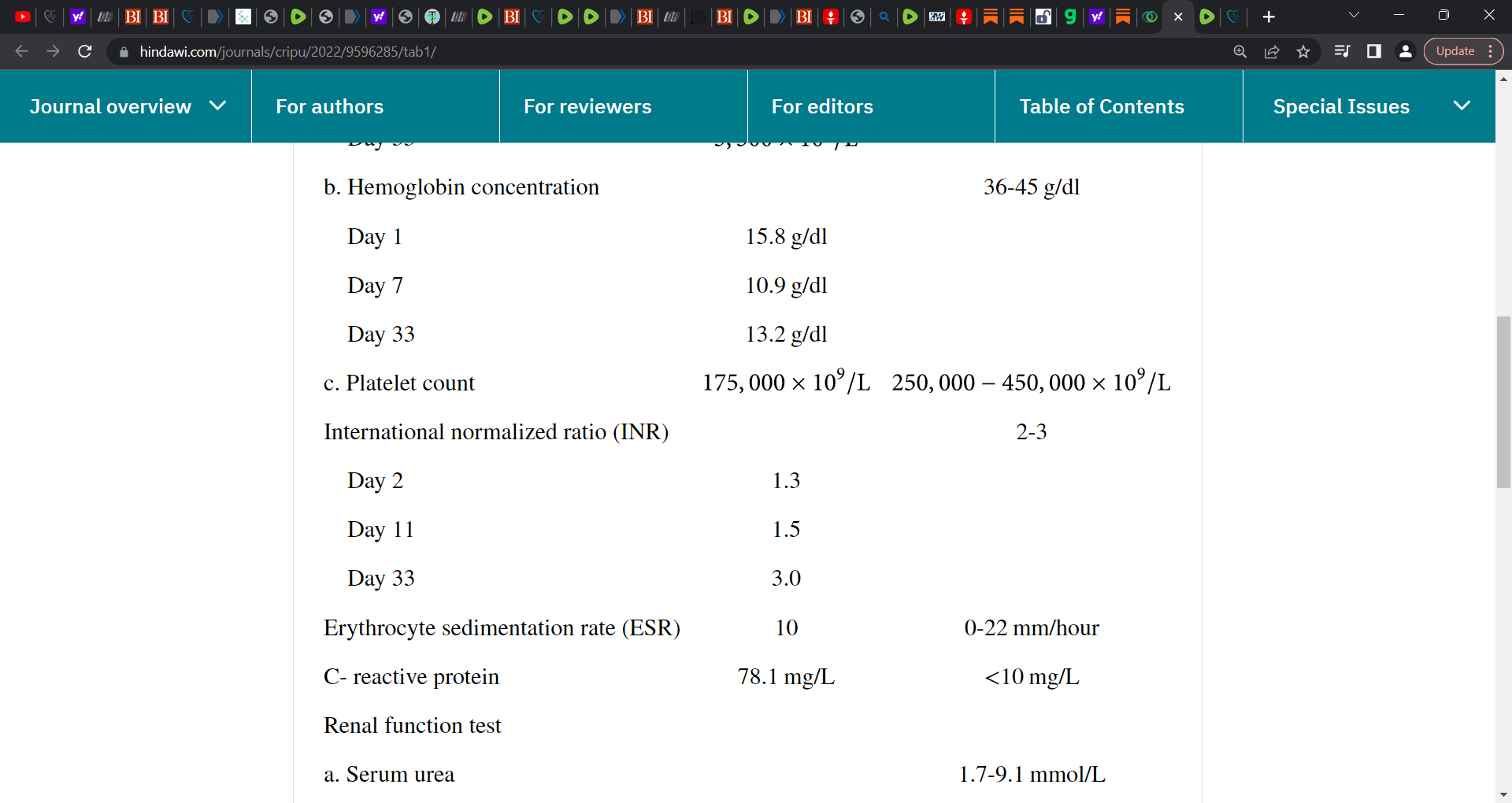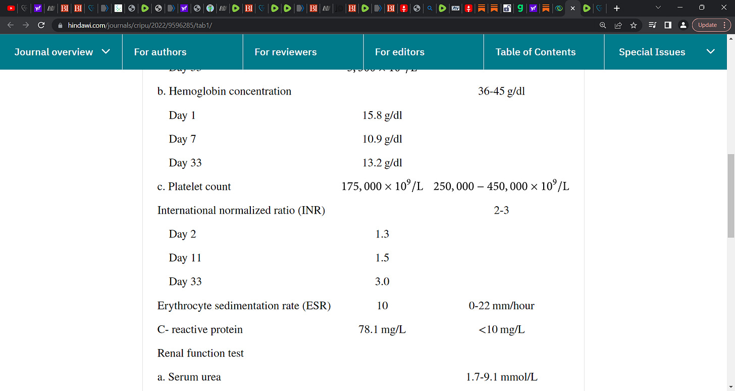 An assessment of bilateral pulmonary embolism was made and the patient was moved to the Intensive Care Unit (ICU). He was commenced on Subcutaneous Enoxaparin 80 mg 12 hourly immediately. IV streptokinase 250,000 units was given over 30 minutes and then followed up by 100,000 units after 1 hour. On subsequent reviews, he continued to make sustained clinical improvement. He was moved from the ICU to the medical ward on the 19th day of admission with oxygen saturation of 95-99% on an oxygen concentrator and was commenced on Tab Warfarin 7.5 mg nocte and Tab Sildenafil Citrate 20 mg twice daily. During his admission, he had serial complete blood count, electrolyte, urea and creatinine, and clotting profile tests done. (Table 1) The possibility of a hypercoagulable state was considered, however, protein C and S assays were within normal limits. He was weaned off oxygen on the 28th day of admission.