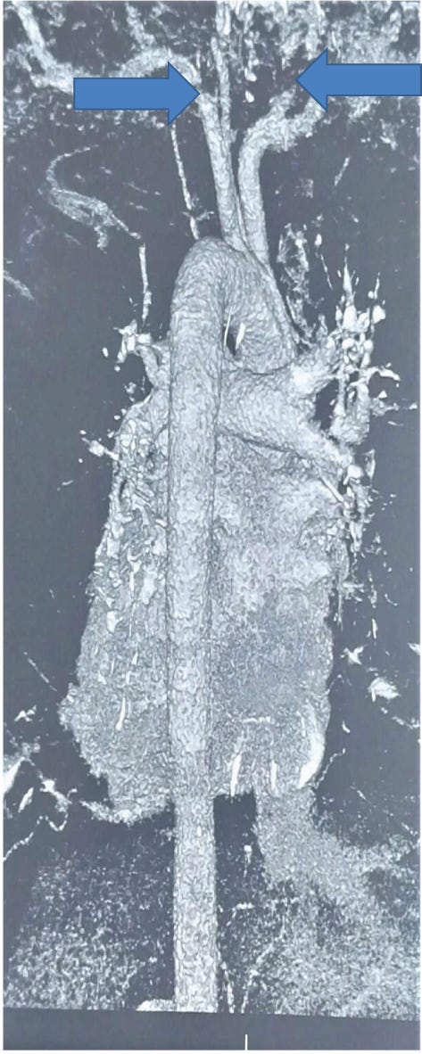 Computed tomography and pulmonary angiography of the chest in the index patient showing near complete occlusion of both right and left pulmonary arteries.