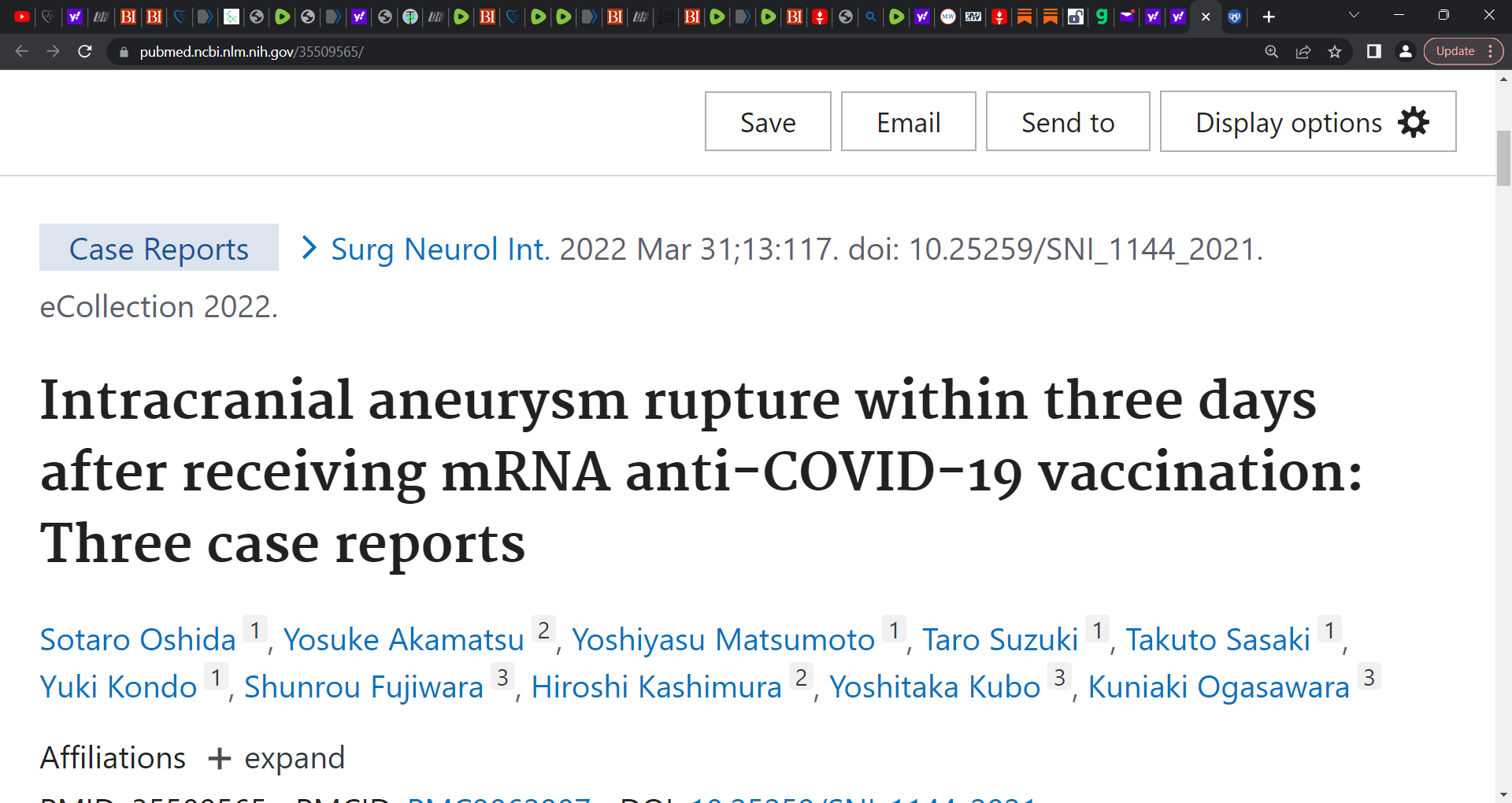 Did Oshida et al. report risk of intracranial brain aneurysm rupture within three days after receiving mRNA technology based anti-COVID-19 vaccination? Yes! cases of aneurysmal subarachnoid hemorrhage