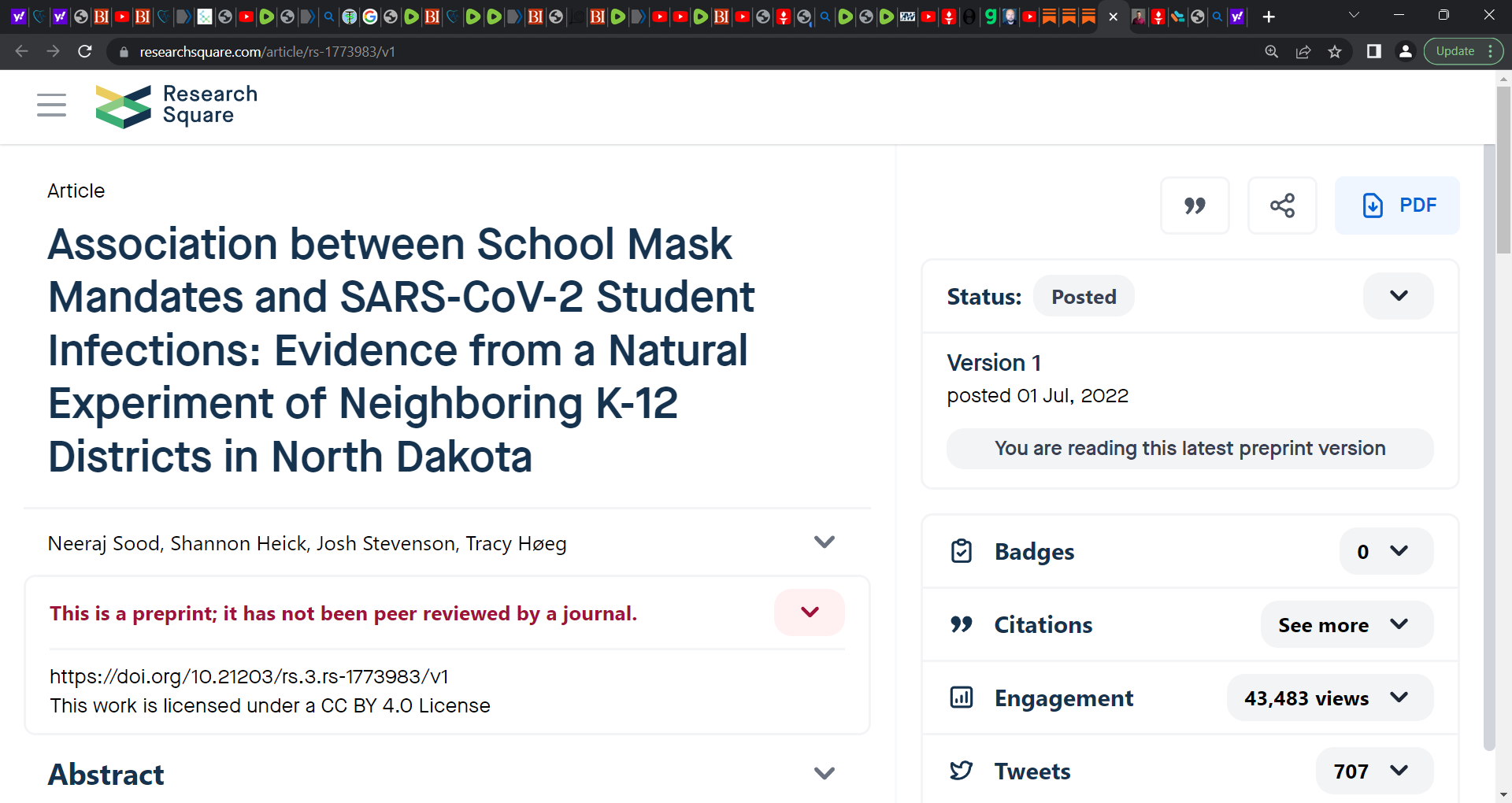 ‘study took advantage of a unique natural experiment of two adjacent K-12 school districts in Fargo, North Dakota, one which had a mask mandate and one which did not in the fall of the 2021-2022 academic year. In the winter, both districts adopted a masks-optional policy allowing for a partial crossover study design. We observed no significant difference between student case rates while the districts had differing masking policies (IRR 0.99; 95% CI: 0.92 to 1.07) nor while they had the same mask policies (IRR 1.04; 95% CI: 0.92 to 1.16). The IRRs across the two periods were also not significantly different (p = 0.40). Our findings contribute to a growing body of literature which suggests school-based mask mandates have limited to no impact on the case rates of COVID-19 among K-12 students.’