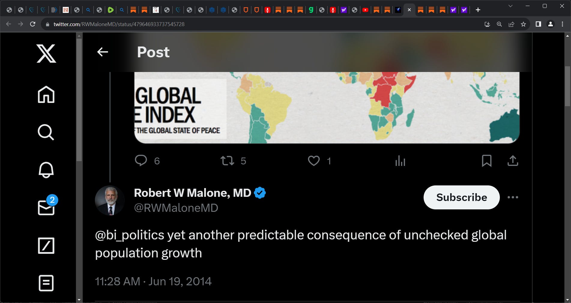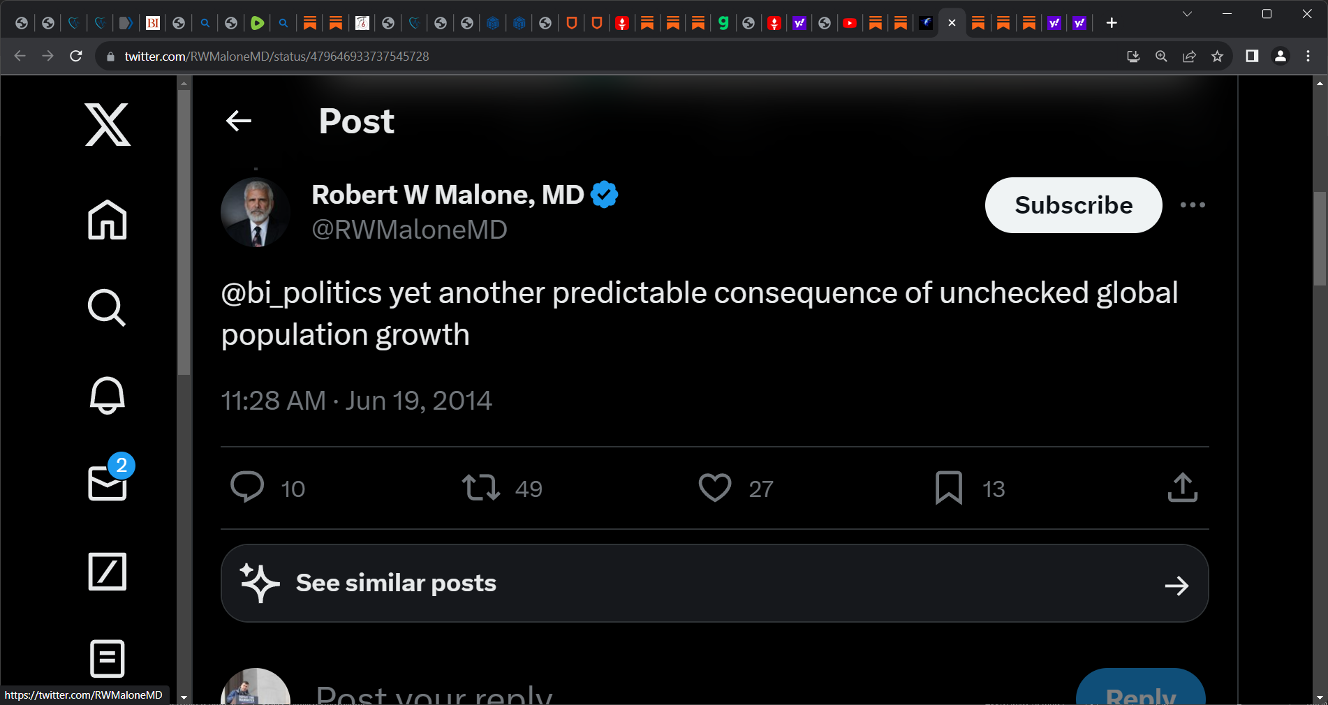 Did Robert Malone in 2014, use these words: "yet another predictable consequence of unchecked global population growth" in response to Insider Politics tweet?