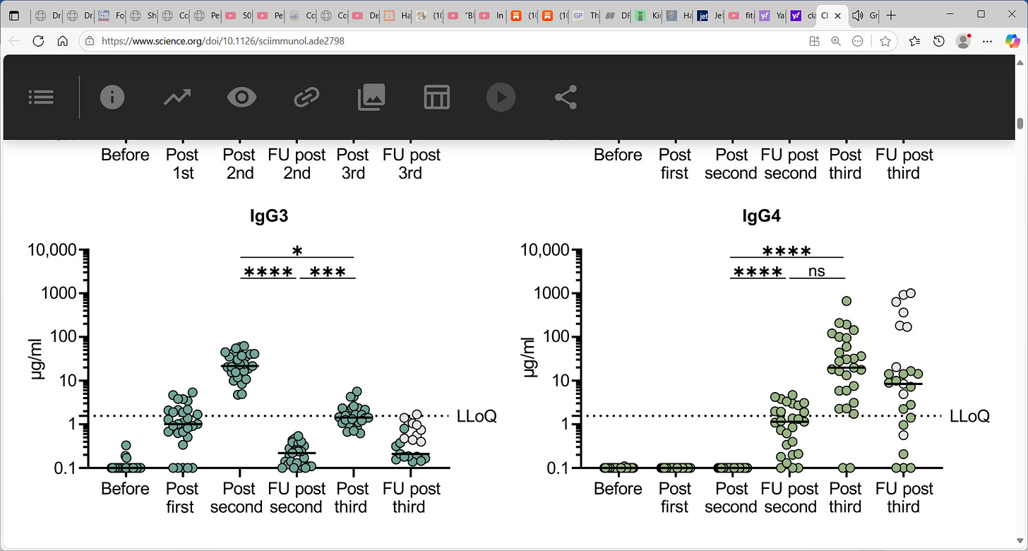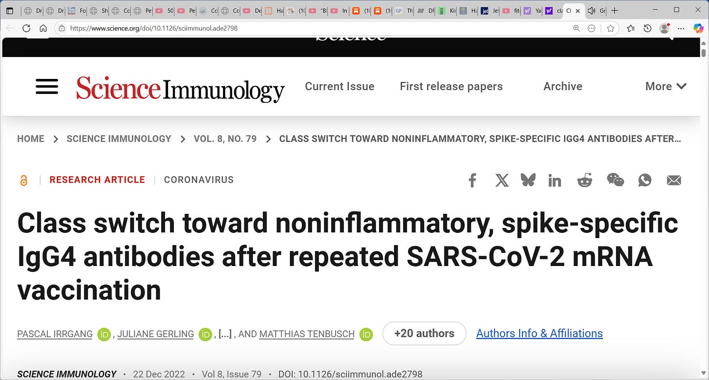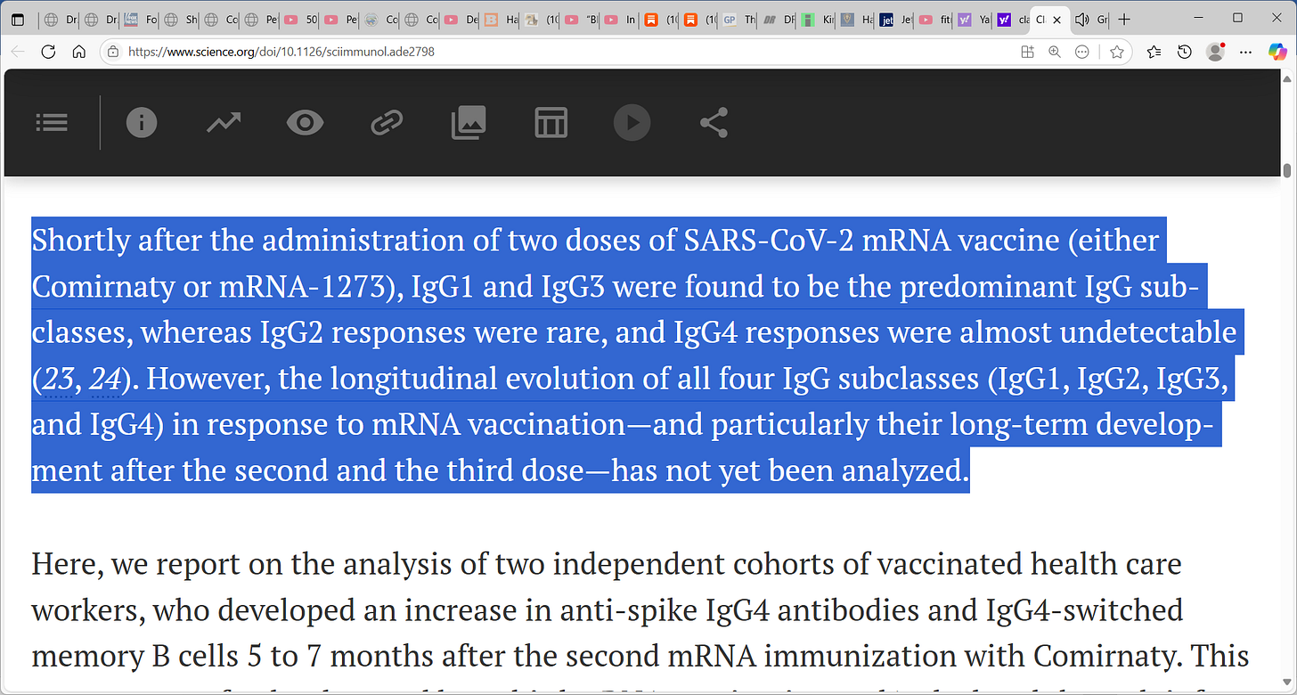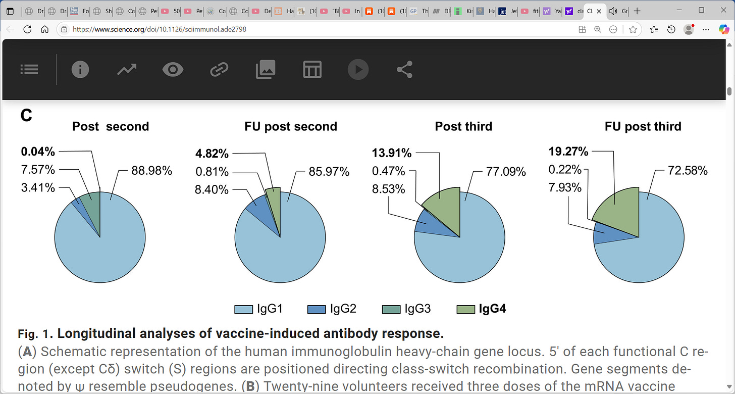 Irrgang et al. told us that with repeated BOOSTER mRNA shots, in 2022, that there was a class-switch towards the IgG4 antibodies and I wrote about this prior; they conducted ‘a longitudinal analysis of the level of spike-specific antibodies from each IgG subclass in recipients of the SARS-CoV-2 BNT162b2 mRNA vaccine (Pfizer).