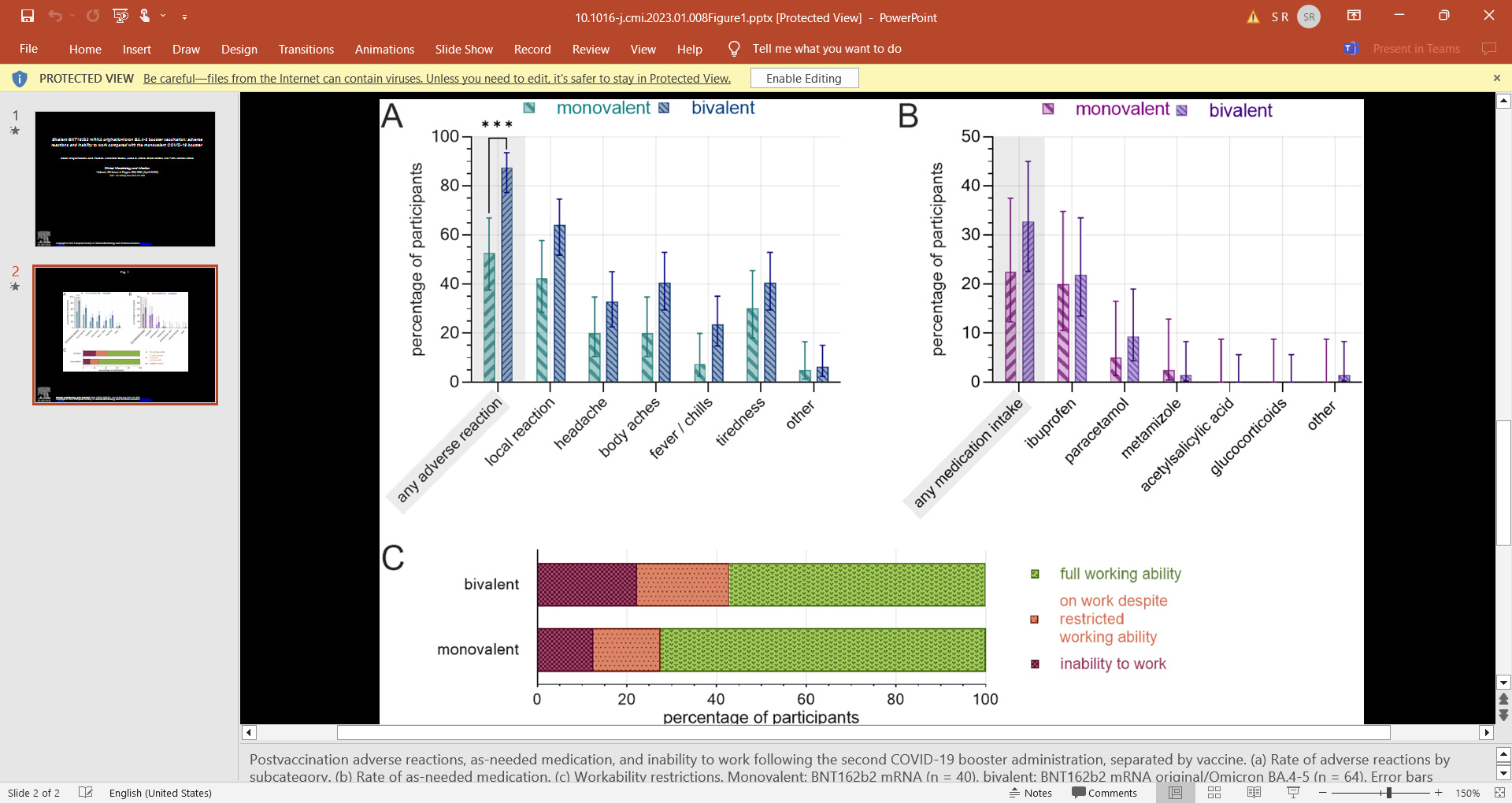 Also, there were more frequent intake of as-needed medication (Fig. 1(b)), numerically higher rates of workability restrictions (Fig. 1(c)), and longer mean duration of the inability to work (2.1 ± 3.5 vs. 1.2 ± 0.4 days) in the bivalent-vaccinated group.