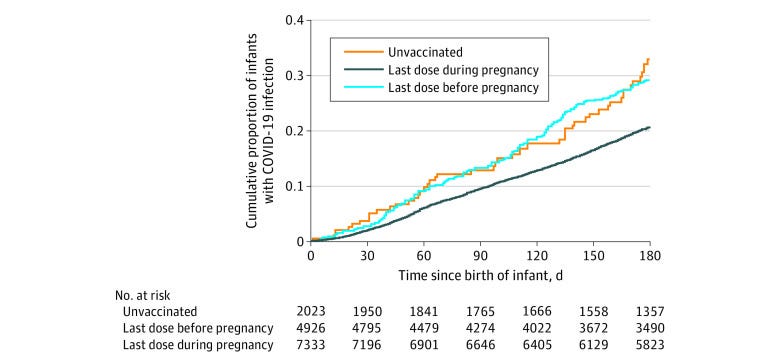Figure 2.. Cumulative Proportion of Infants With SARS-CoV-2 Infection by Maternal Vaccination Status