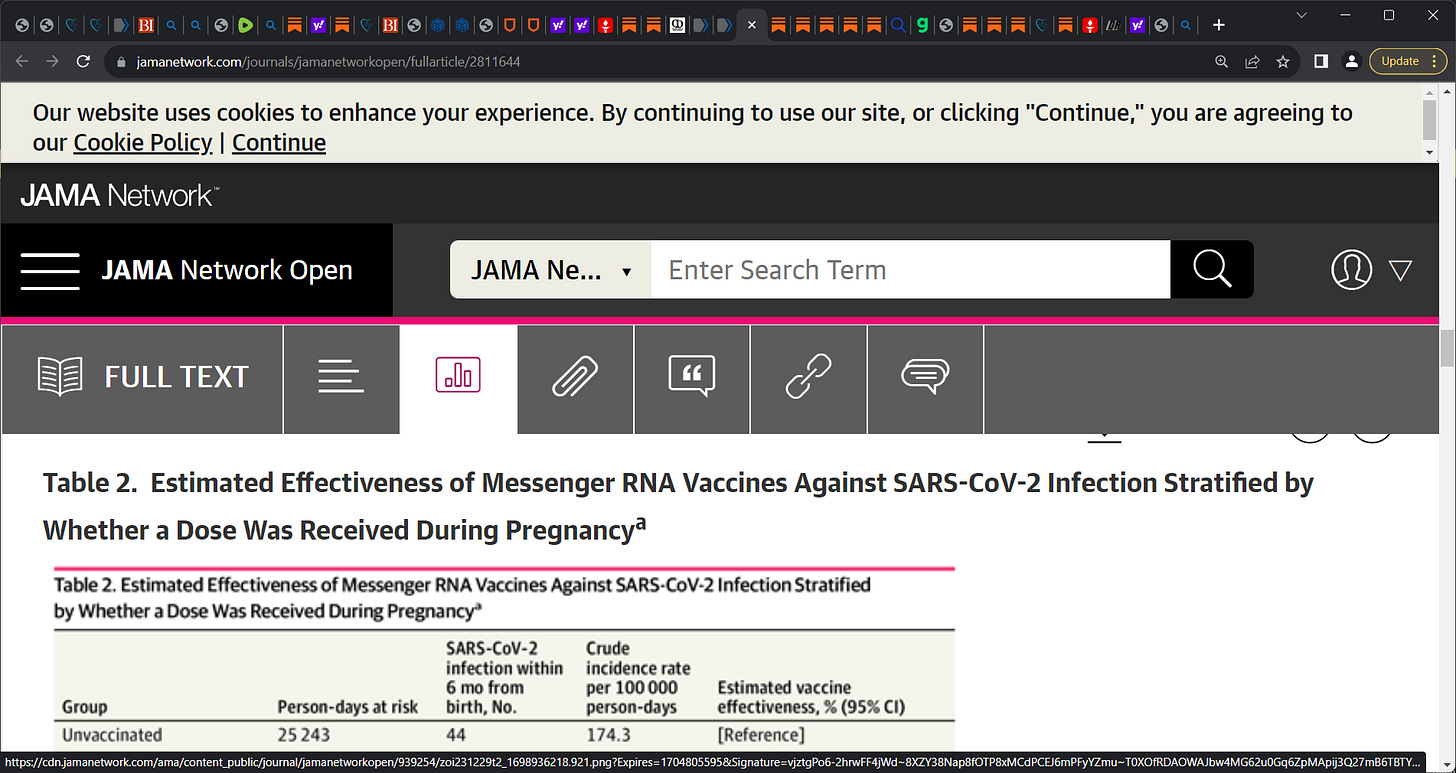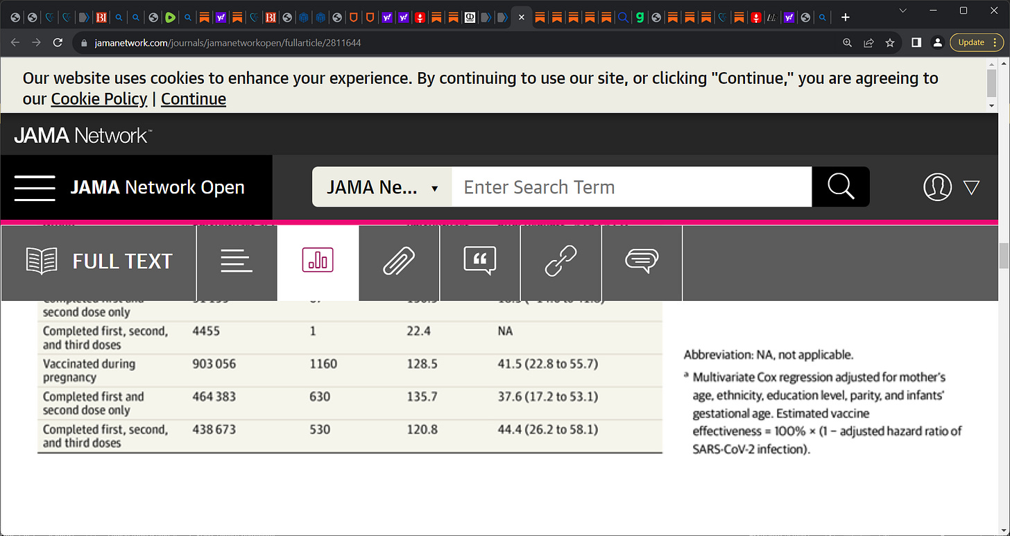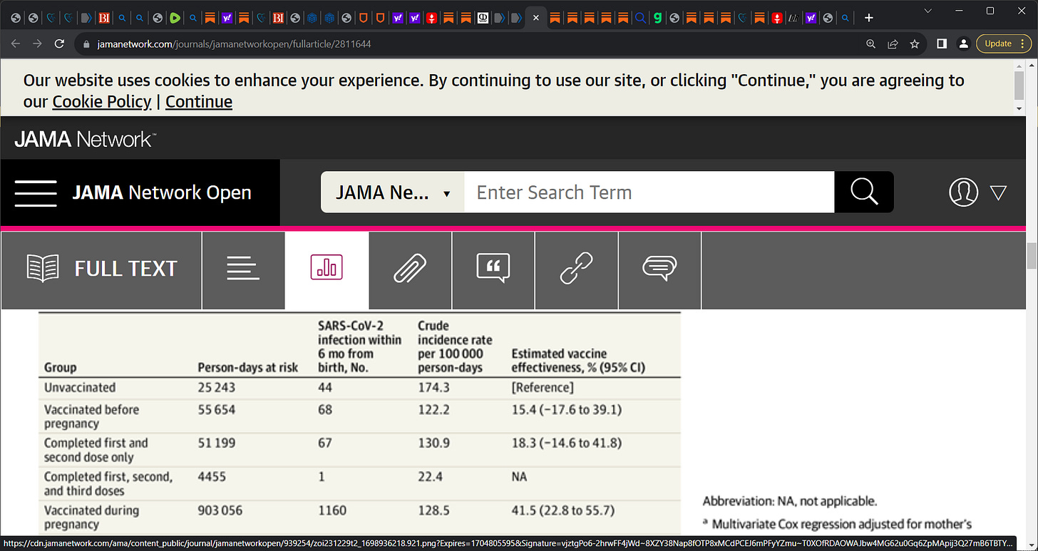 ‘Objective: To investigate maternal vaccination against Omicron variants, including XBB, and the association of vaccination timing during pregnancy vs prior to pregnancy and risks of SARS-CoV-2 infection among infants aged 6 months or younger.