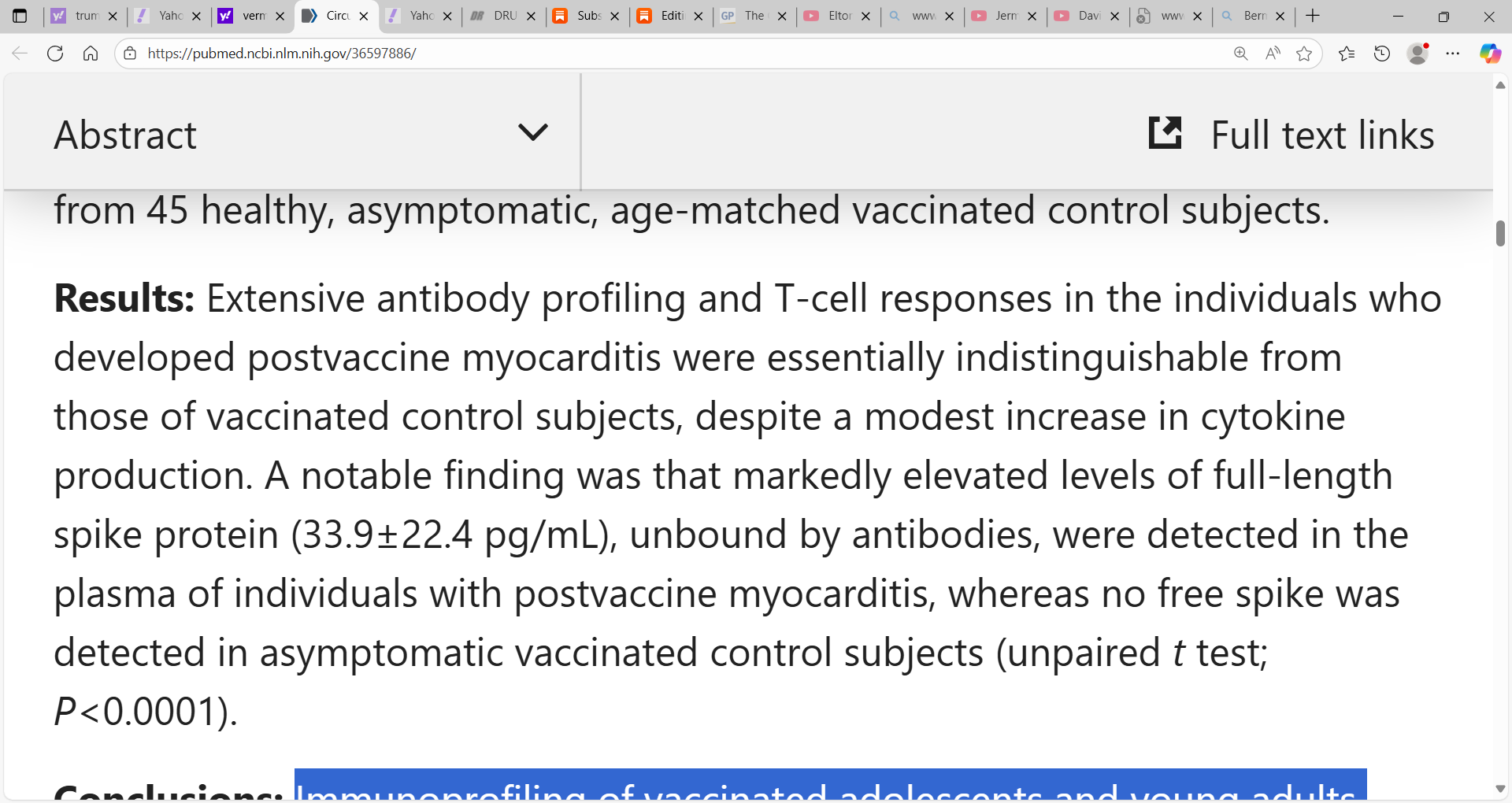 with chest pain with elevated cardiac troponin T after SARS-CoV-2 vaccination, actually find markedly elevated levels of full-length spike protein (33.9±22.4 pg/mL), unbound by antibodies, detected
