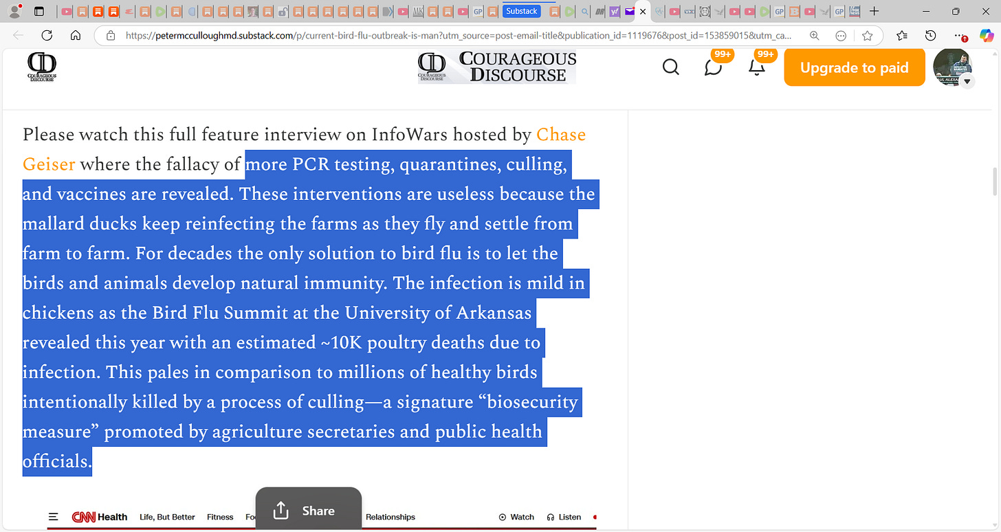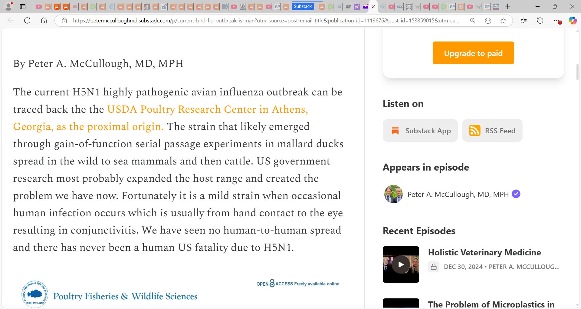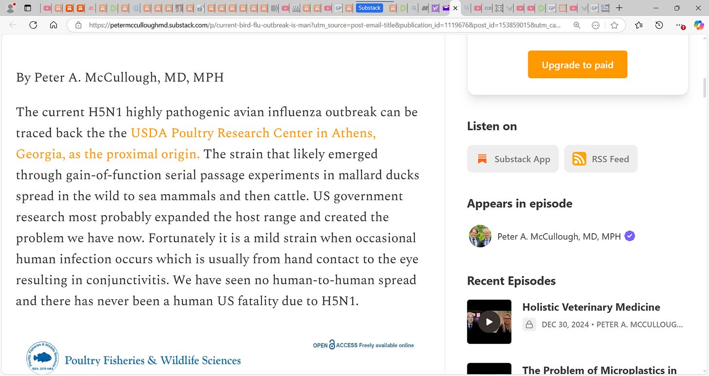 The idiot is not saying that it is the culling of the birds and fowl and animals that is causing humans to become infected, what an a**. It is clear that the current bird flu outbreak is because of man’s actions (see McCullough below). There is not one human death due to H5NA. Is she, Wen, that stupid? We have no human-to-human transmission, a few instances of pink eye conjunctivitis etc. This lady is a lunatic as Birx, if that was even possible. This is pure fear porn again and a move to bring a PCR false positive manufactured avian bird flu pandemic out of NOTHING. Fake, fraud, using same playbook of the fraud of COVID.