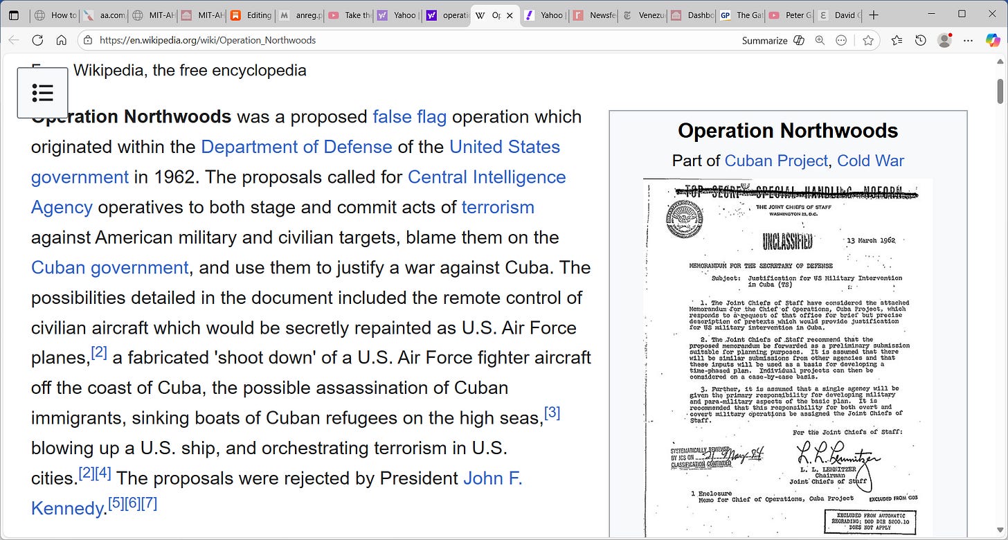Operation Northwoods was a proposed false flag operation which originated within the Department of Defense of the United States government in 1962. The proposals called for Central Intelligence Agency operatives to both stage and commit acts of terrorism against American military and civilian targets, blame them on the Cuban government, and use them to justify a war against Cuba. The possibilities detailed in the document included the remote control of civilian aircraft which would be secretly repainted as U.S. Air Force planes,[2] a fabricated 'shoot down' of a U.S. Air Force fighter aircraft off the coast of Cuba, the possible assassination of Cuban immigrants, sinking boats of Cuban refugees on the high seas,[3] blowing up a U.S. ship, and orchestrating terrorism in U.S. cities.[2][4] The proposals were rejected by President John F. Kennedy.[5][6][7]