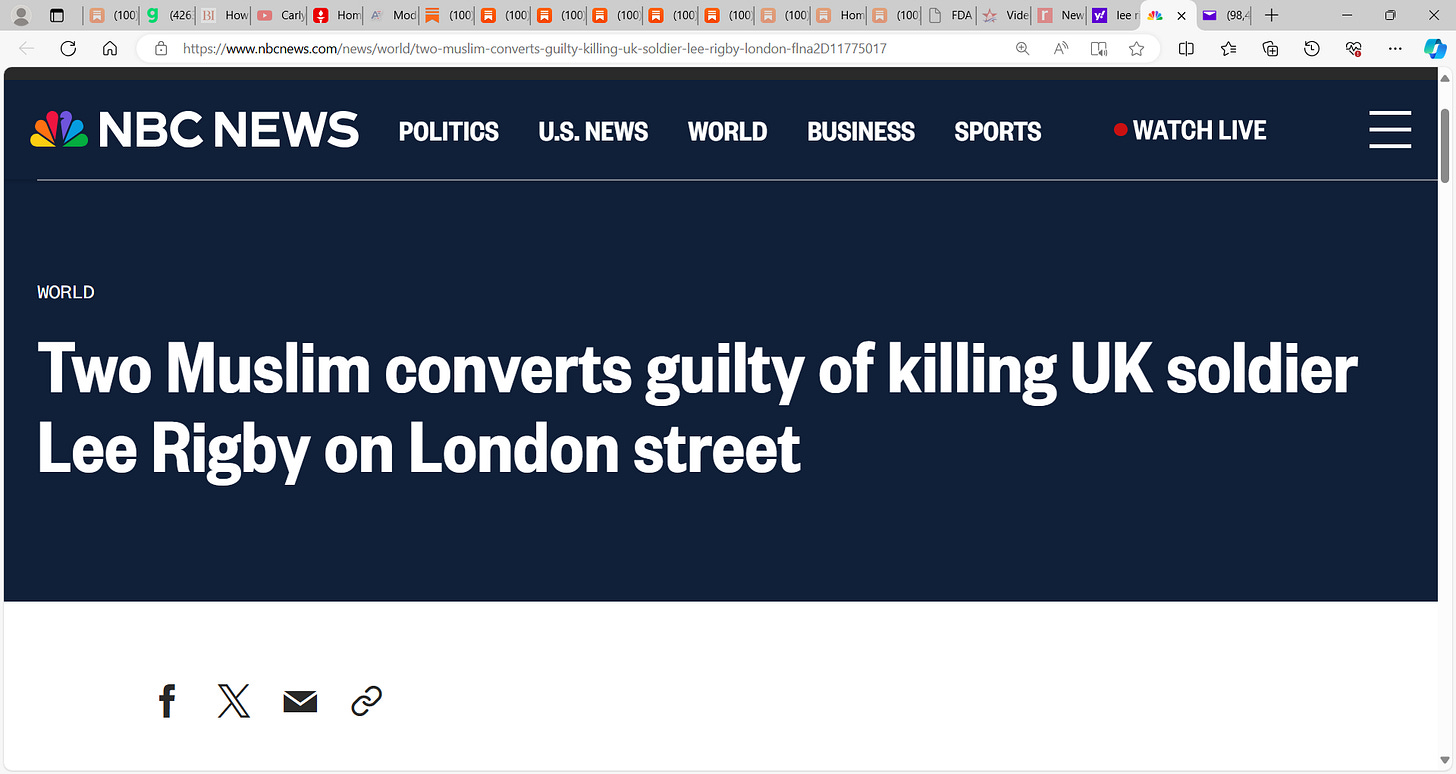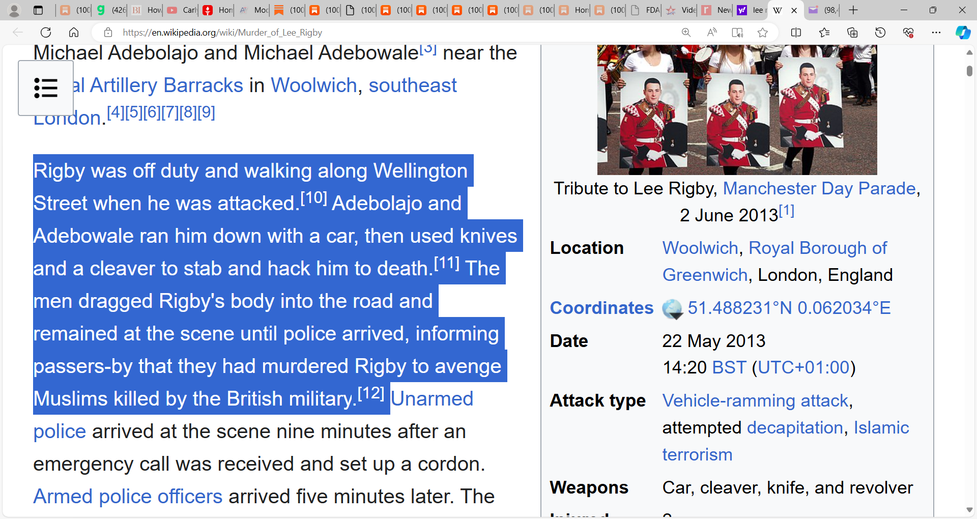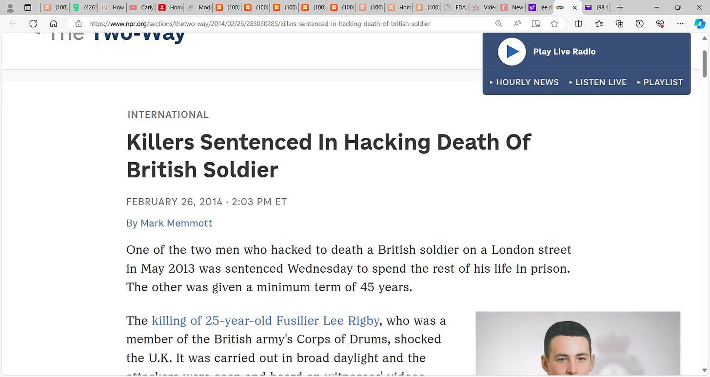Do not forget British Army soldier, Fusilier 'Lee Rigby' of the Royal Regiment of Fusiliers, was attacked and killed by Islamist terrorists Michael Adebolajo and Michael Adebowale; he was beheaded