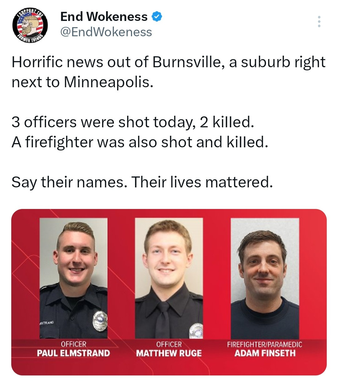 Do not forget them! Officers Matthew Ruge, 27, and Paul Elmstrand, 27, along with 40-year-old paramedic and firefighter Adam Finseth were shot dead in Minnesota; it is time we HANG people who shoot