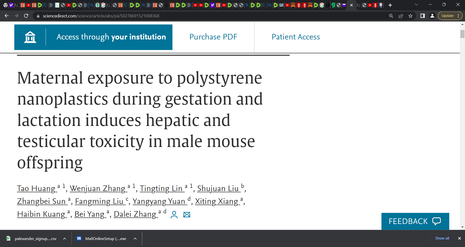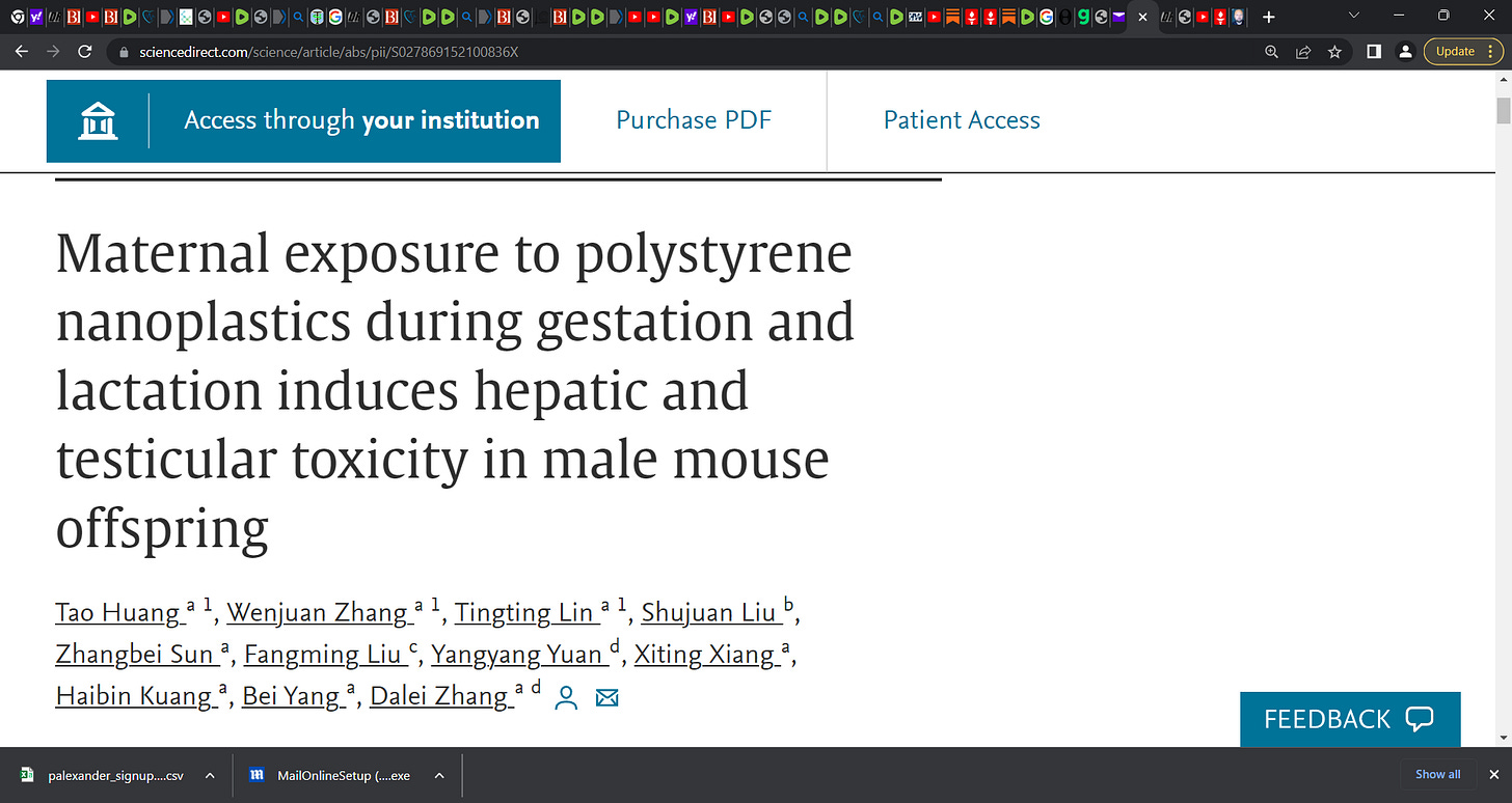 ‘Our data illustrated that maternal PS-NPs exposure in pregnancy and lactation resulted in a decline in birth and postnatal body weight in offspring mice. Furthermore, high-dose PS-NPs reduced liver weight, triggered oxidative stress, caused inflammatory cell infiltration, up-regulated proinflammatory cytokine expression, and disturbed glycometabolism in the liver of male offspring mice. In addition, pre- and postnatal PS-NPs exposure diminished testis weight, disrupted seminiferous epithelium and decreased sperm count in mouse offspring. Moreover, PS-NPs induced testicular oxidative injury, as presented by increased malondialdehyde generation and altered superoxide dismutase and catalase activities in the testis of offspring mice. These findings declared that maternal exposure to PS-NPs in pregnancy and lactation can cause hepatic and testicular toxicity in male mouse pups, which put forward new understanding into the detrimental effects of nanoplastics on mammalian offspring.’