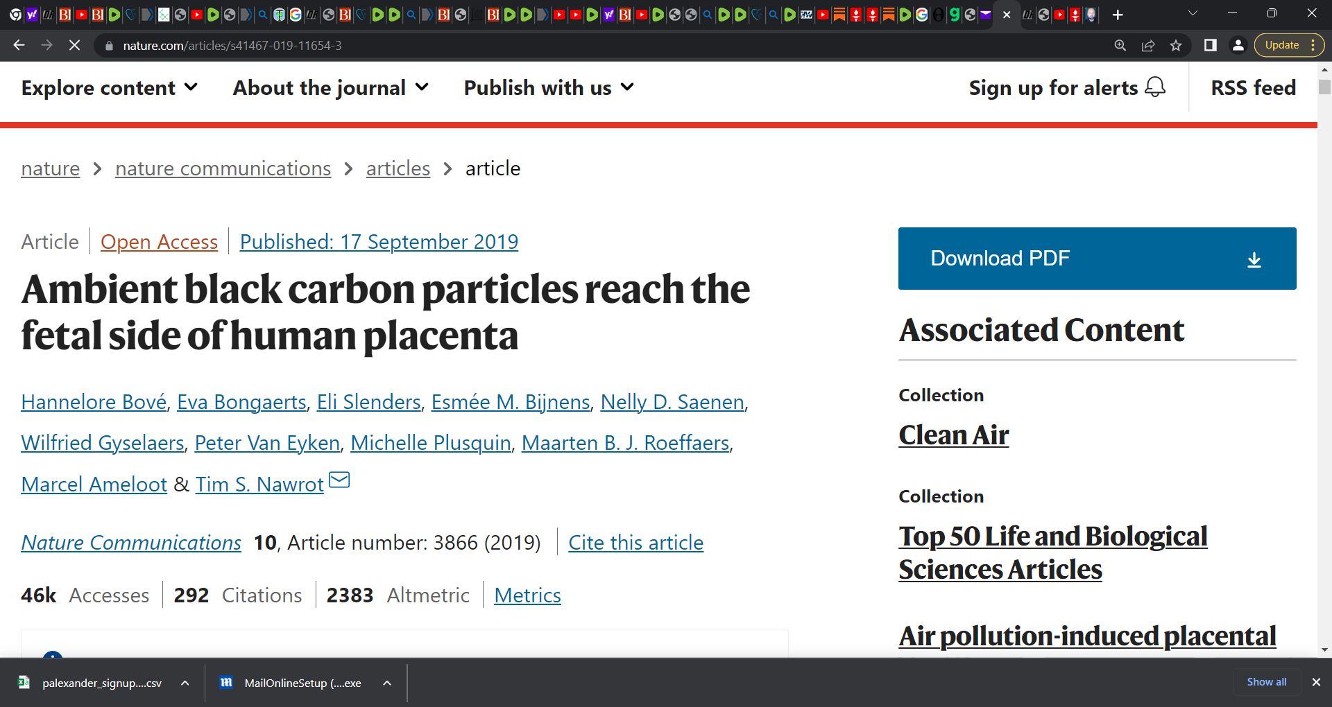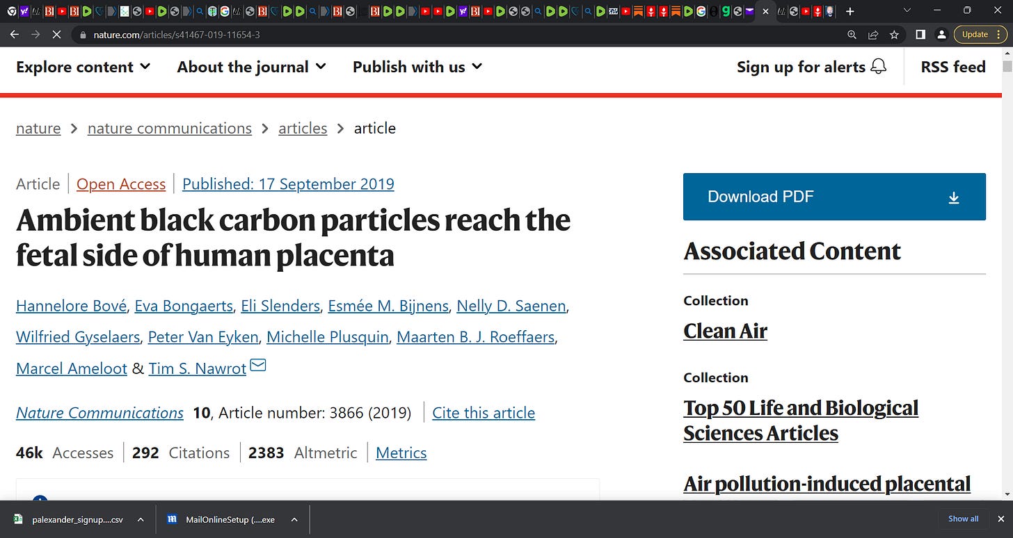 ‘Particle transfer across the placenta has been suggested but to date, no direct evidence in real-life, human context exists. Here we report the presence of black carbon (BC) particles as part of combustion-derived particulate matter in human placentae using white-light generation under femtosecond pulsed illumination. BC is identified in all screened placentae, with an average (SD) particle count of 0.95 × 104 (0.66 × 104) and 2.09 × 104 (0.9 × 104) particles per mm3 for low and high exposed mothers, respectively. Furthermore, the placental BC load is positively associated with mothers’ residential BC exposure during pregnancy (0.63–2.42 µg per m3). Our finding that BC particles accumulate on the fetal side of the placenta suggests that ambient particulates could be transported towards the fetus and represents a potential mechanism explaining the detrimental health effects of pollution from early life onwards.’