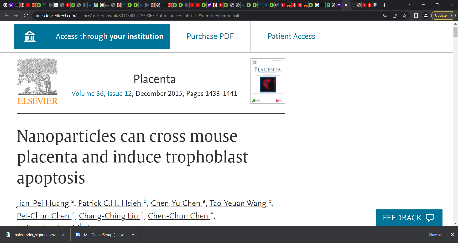 ‘We included 73 studies on placental translocation of particles, of which 21 in vitro/ex vivo studies, 50 animal studies, and 2 human studies on transplacental particle transfer. This systematic review shows that (i) (ultra)fine particles and engineered nanoparticles can bypass the placenta and reach fetal units as observed for all the applied models irrespective of the species origin (i.e., rodent, rabbit, or human) or the complexity (i.e., in vitro, ex vivo, or in vivo), (ii) particle size, particle material, dose, particle dissolution, gestational stage of the model, and surface composition influence maternal-fetal translocation, and (iii) no simple, standardized method for nanoparticle detection and/or quantification in biological matrices is available to date. Existing evidence, research gaps, and perspectives of maternal-fetal particle transfer are highlighted.’