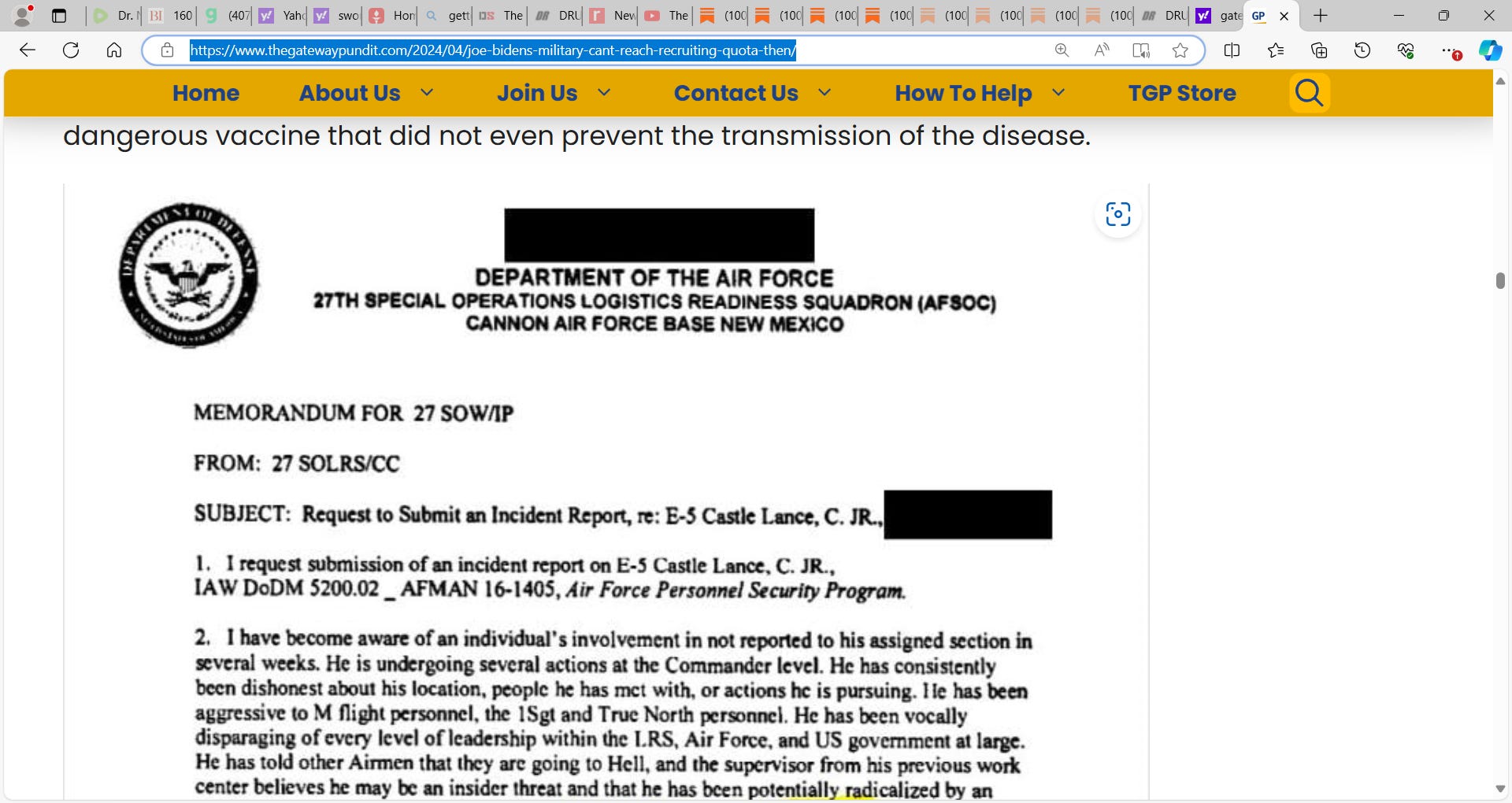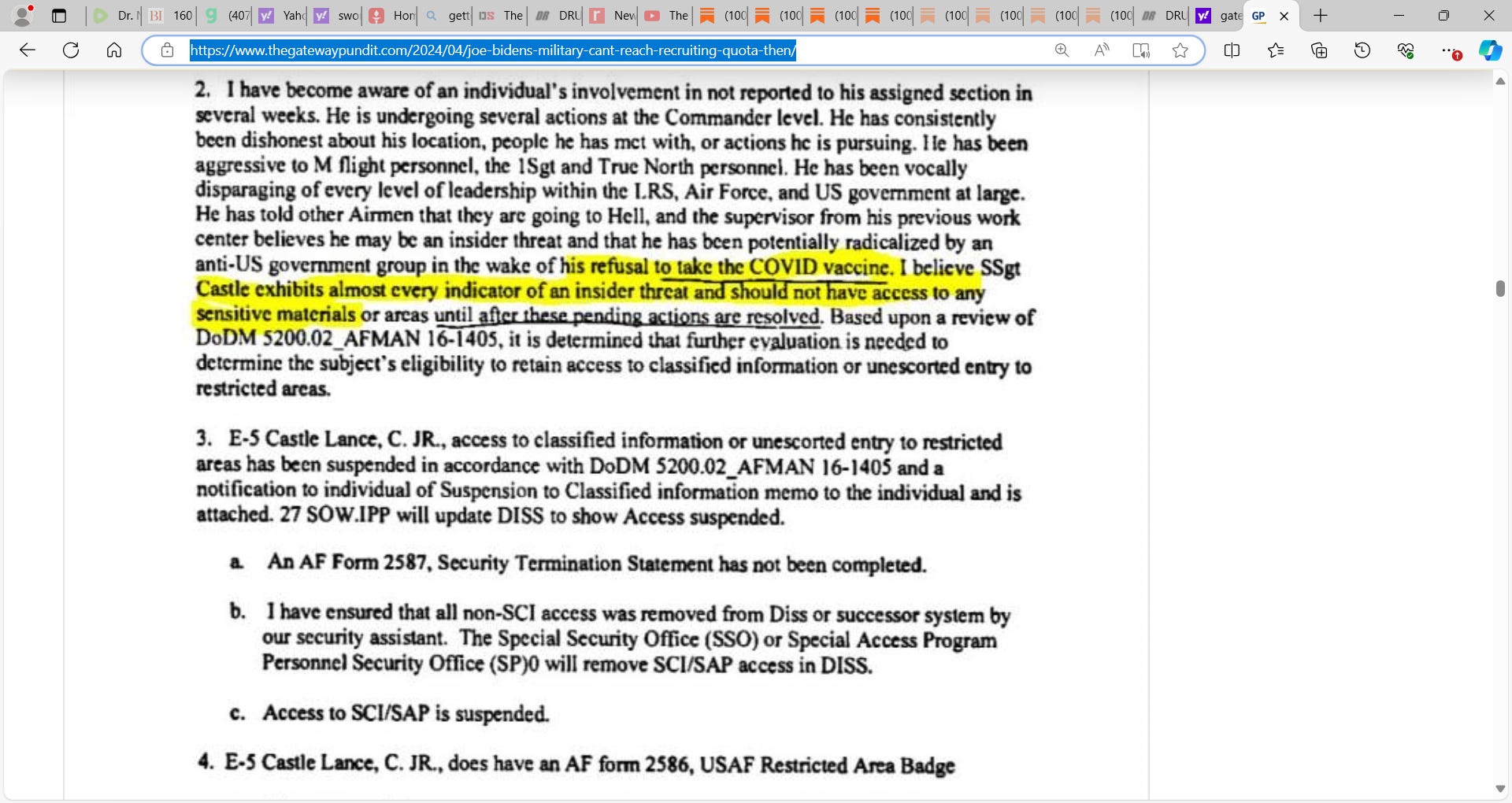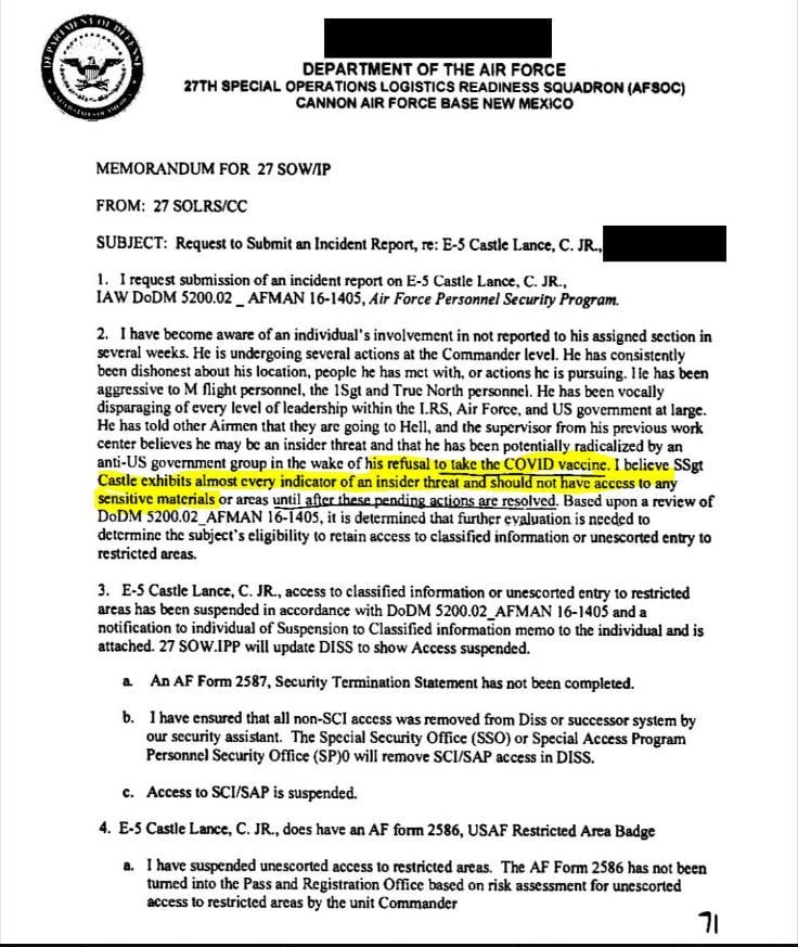 E-5 Lance Castle was labeled an “insider threat” for not taking the mandatory COVID vaccine – a dangerous vaccine that did not even prevent the transmission of the disease.