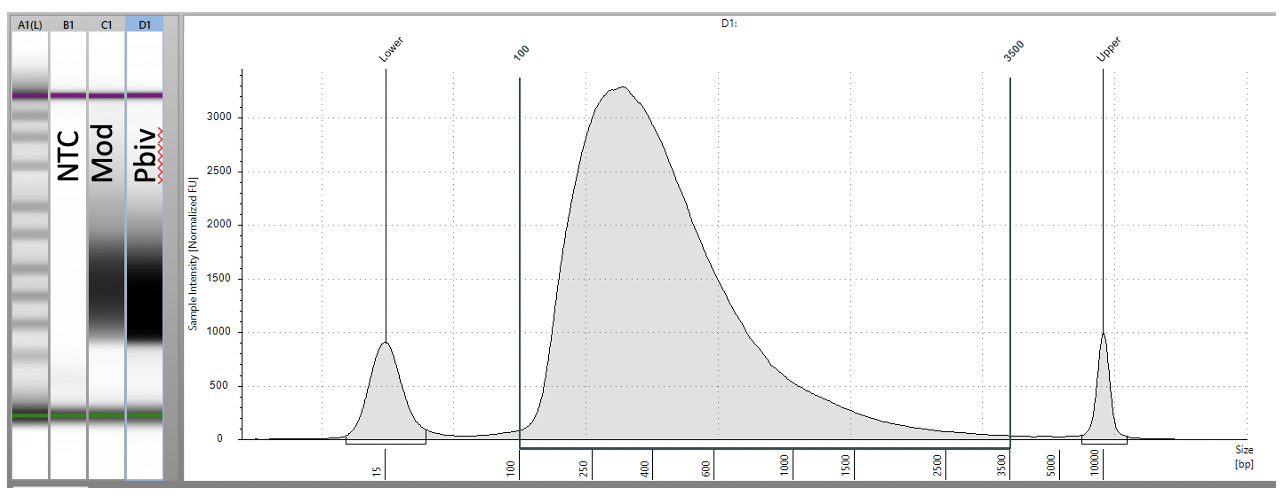Some variability in qPCR performance was noted with our LiDs/SPRI purification method of the vaccines. This left some samples opaque and is believed to be residual LNPs in the purification. A CTAB/Chloroform/SPRI isolation was optimized to address this and used for further qPCR and Agilent electrophoresis in Figures 10, 11 and 12. Briefly, 300ul of Vaccine was added to 500ul of CTAB (MGC solution A in SenSATIVAx MIP purification kit. #420004). The sample was then vortexed and heated for 5 minutes at 37C. 800ul of chloroform was added, vortexed and spun at 19,000 rpms for 3 minutes. The top 250ul of aqueous phase was collected and added to 250ul of solution B and 1ml of magnetic binding buffer. Samples were vortexed and incubated for 5 minutes and magnetically separated. The supernatant was removed and the beads washed with 70% Ethanol two times. Samples were finally eluted in 300ul of MGC elution buffer.