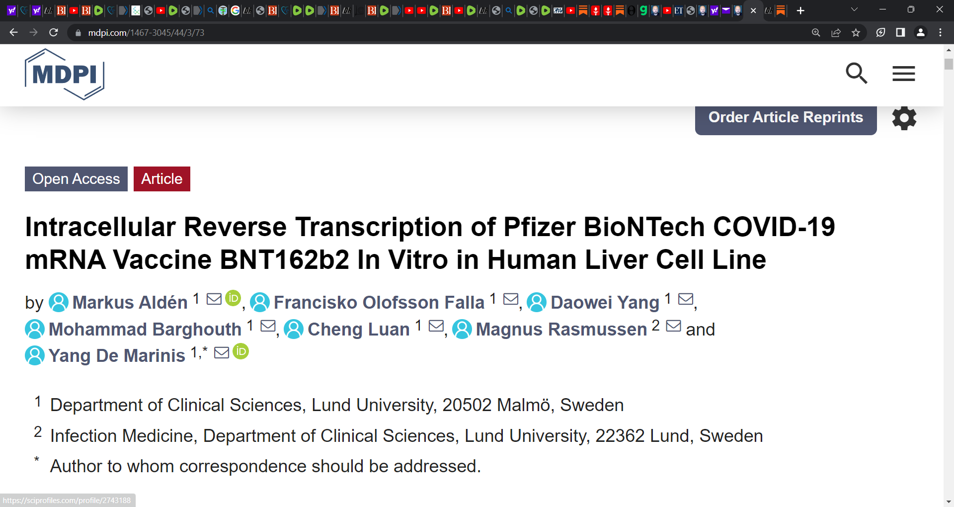 ‘In this study, we investigated the effect of BNT162b2 on the human liver cell line Huh7 in vitro. Huh7 cells were exposed to BNT162b2, and quantitative PCR was performed on RNA extracted from the cells. We detected high levels of BNT162b2 in Huh7 cells and changes in gene expression of long interspersed nuclear element-1 (LINE-1), which is an endogenous reverse transcriptase. Immunohistochemistry using antibody binding to LINE-1 open reading frame-1 RNA-binding protein (ORFp1) on Huh7 cells treated with BNT162b2 indicated increased nucleus distribution of LINE-1. PCR on genomic DNA of Huh7 cells exposed to BNT162b2 amplified the DNA sequence unique to BNT162b2. Our results indicate a fast up-take of BNT162b2 into human liver cell line Huh7, leading to changes in LINE-1 expression and distribution. We also show that BNT162b2 mRNA is reverse transcribed intracellularly into DNA in as fast as 6 h upon BNT162b2 exposure.’