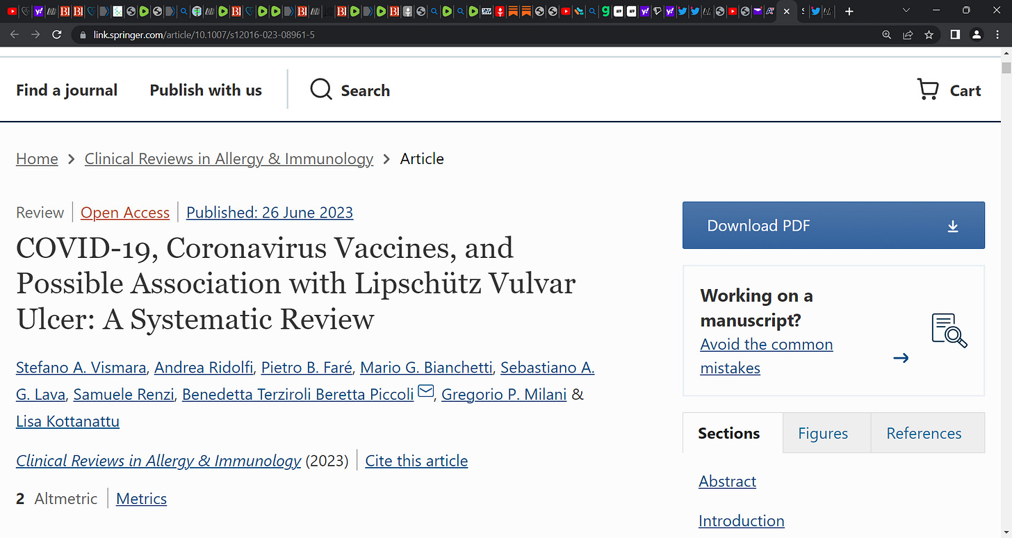 Does the mRNA technology based gene injection increase risk (triggers) of Lipschütz FEMALE genital 'vulvar' ulcer? A recent review (Vismara) raises questions & suggests risk to female genitalia