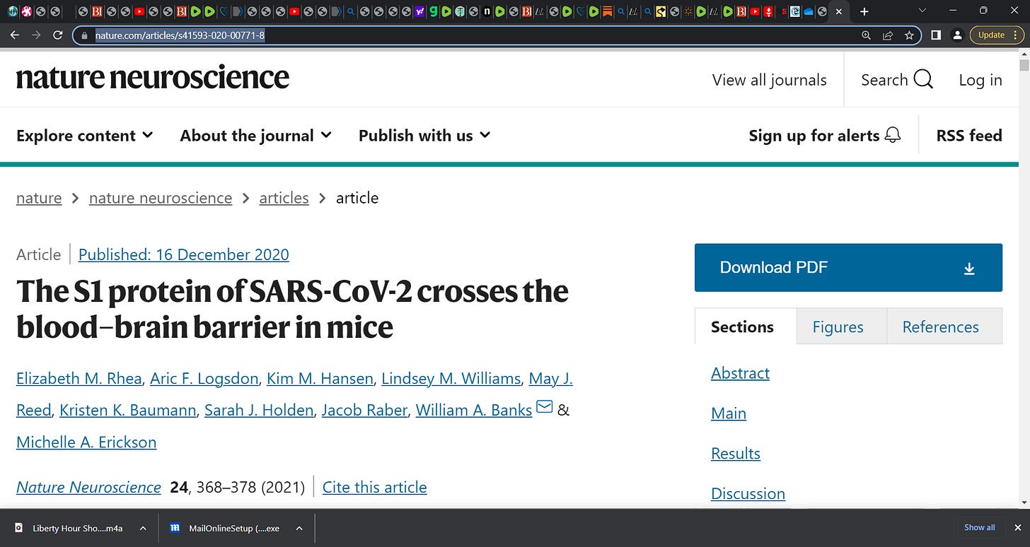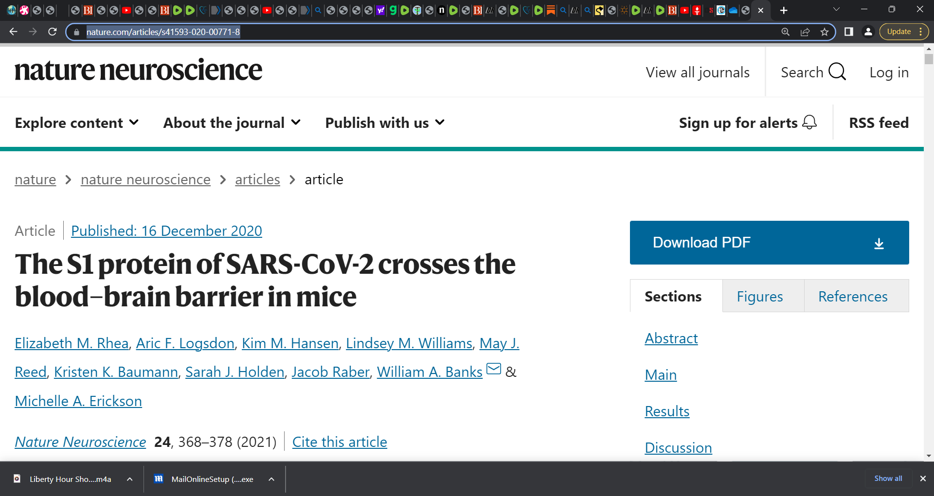Does the S1 (spike) protein of the COVID virus enter the brain, cross the blood-brain barrier (BBB)? Rhea's NATURE study on mice says YES! It is also taken up by the lung, spleen, kidney and liver