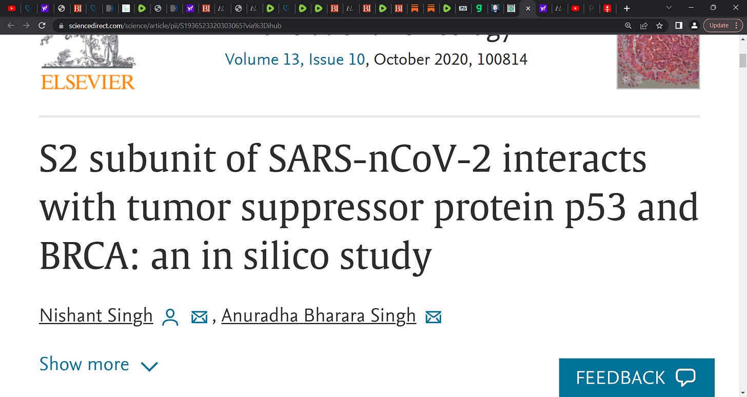 If the SARS-CoV-2 virus doesn't exist then the S2 subunit doesn't exist and therefore the purported strong interactions with the p53 and BRCA tumor suppressor proteins that regulate downstream genes in response to numerous cellular stress and are frequently mutated in human cancer don't exist. Therefore no extrapolation to the shots can be made. The shots are safe for terrain theory believers to take and they need never be concerned about infection because non-existent viruses can't infect anyone.