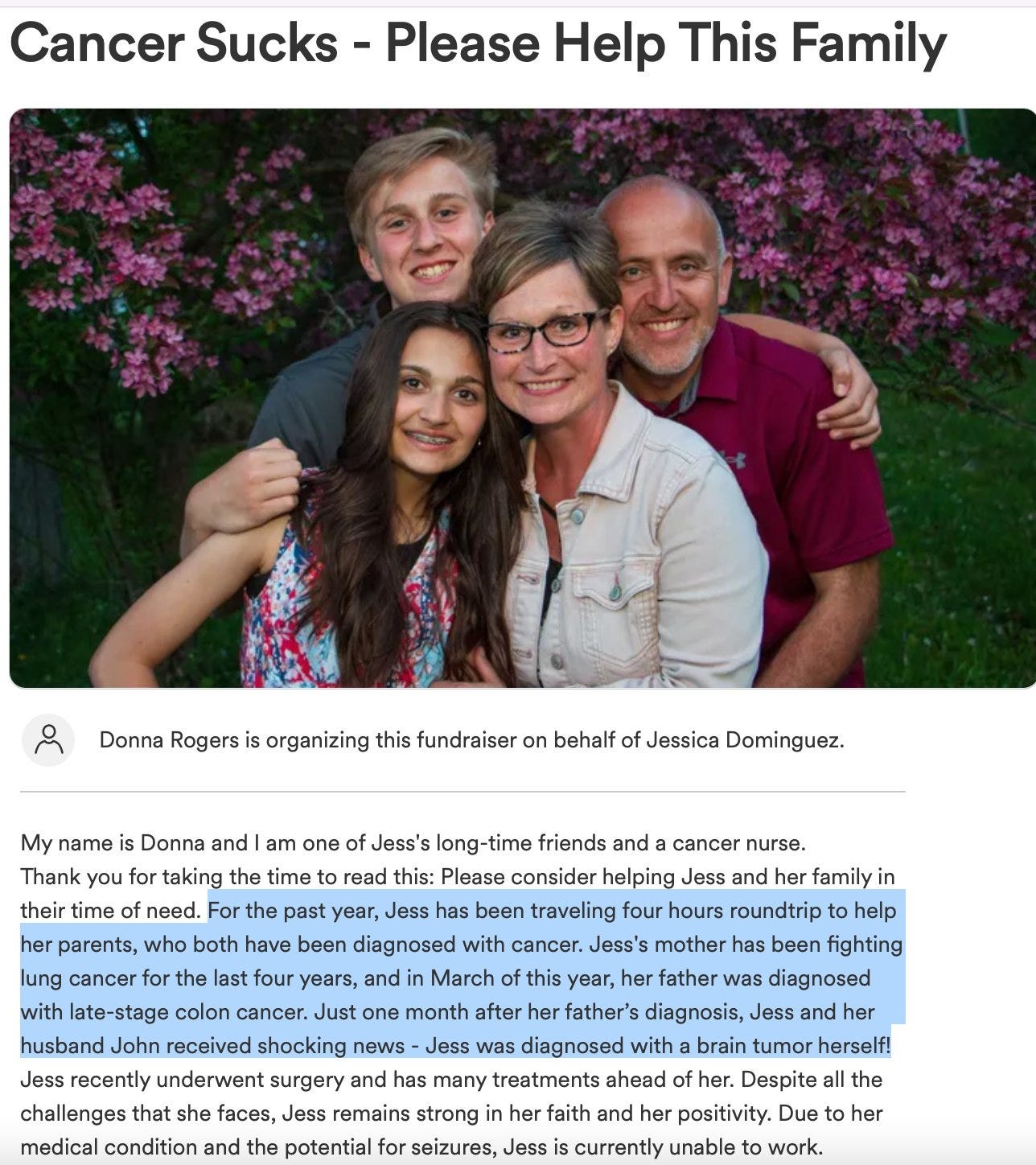June 29, 2023, Baraboo, WI - Three family members develop cancer! - Both of Jessica Dominguez’s parents have been battling end stage cancer, her mother fighting lung cancer last 4 years, and her father diagnosed with late stage Colon cancer in March 2023. Jessica Dominguez herself has just been diagnosed with a brain tumor!
