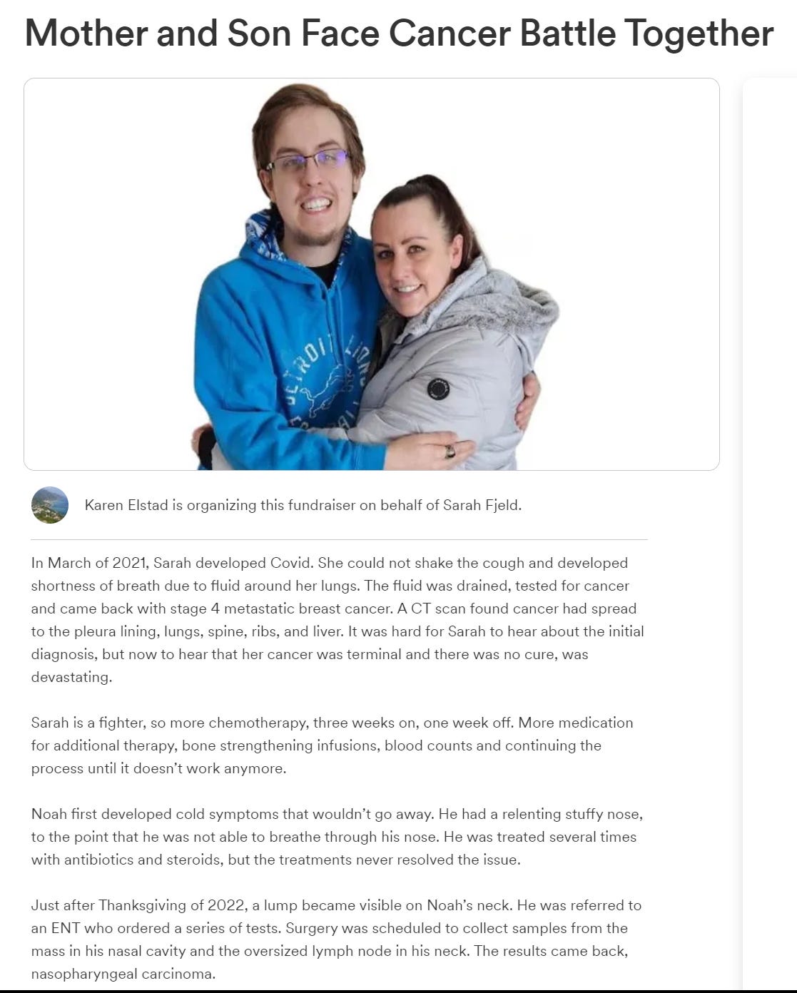 Jan, 2023, Aitkin, MN - Mother and son are both fighting cancer. Sarah Fjeld had Stage 3 breast cancer in 2017 and was cancer free. She developed COVID in March 2021 and was found to have Stage 4 breast cancer recurrence that spread to lungs, bones and liver. Her 20 yo son Noah Fjeld was diagnosed with rare Nasopharyngeal cancer in Nov.2022 (click here)