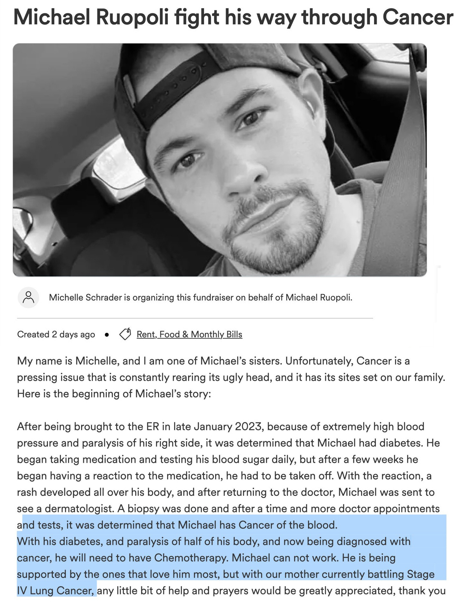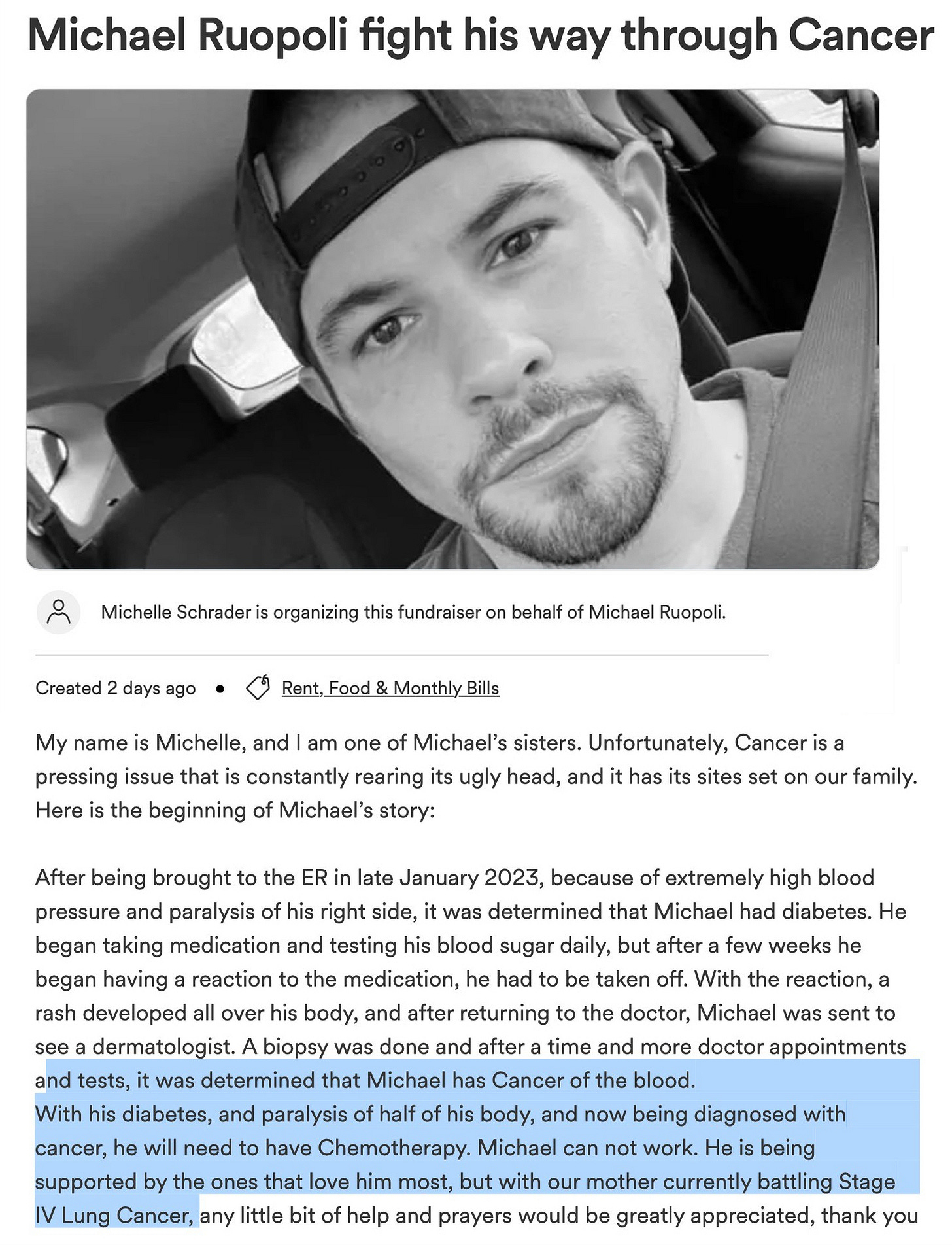 July 23, 2023, Davenport, FL - Michael Ruopoli was just diagnosed with “cancer of the blood”, presumably leukemia, after developing a whole body rash while his mother is currently battling Stage IV Lung Cancer (click here)