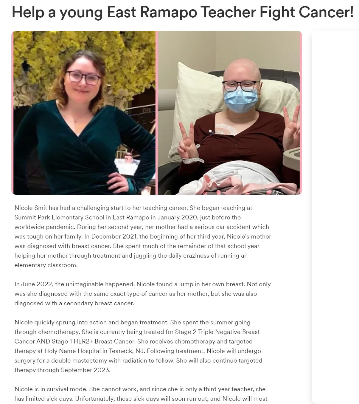 Nov 8, 2022, Valley Cottage, NY - Nicole Smit is a teacher. In Dec.2021, Nicole’s mother was diagnosed with breast cancer. In June 2022, Nicole was diagnosed with the same type of breast cancer as her mother and was also diagnosed with a secondary breast cancer. (click here)