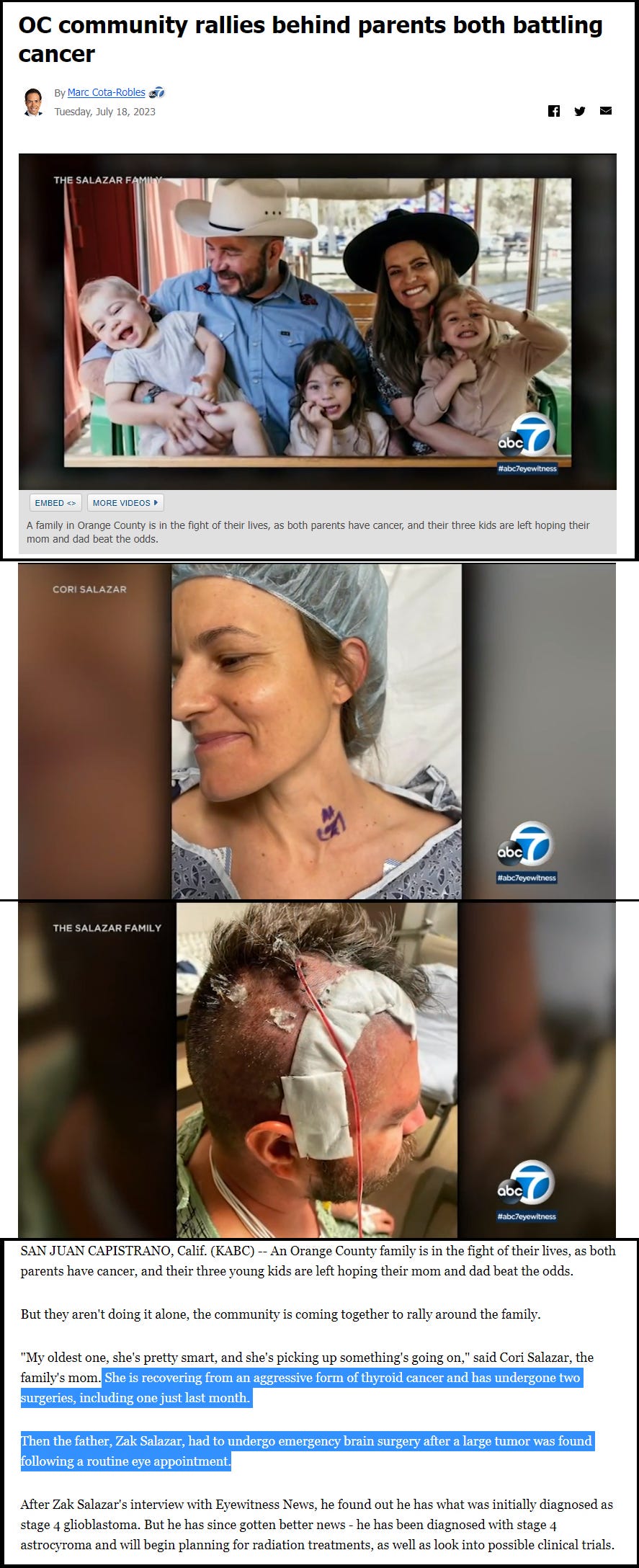 (VIDEO ABOVE) July 18, 2023, San Juan Capistrano, CA - Parents of 3 children, Zak and Cori Salazar were both diagnosed with cancer, mom Cori with an “aggressive form of thyroid cancer” had two surgeries and dad Zak was diagnosed with aggressive Stage 4 Astrocytoma and just had surgery (click here)