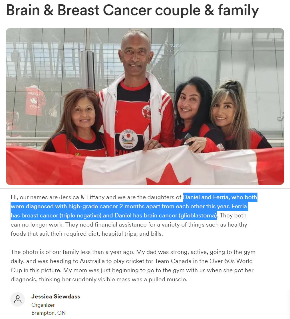 June 26, 2023, Brampton, ON - Daniel Siewdass and Ferria Siewdass were both diagnosed with high grade cancer, Daniel with brain cancer glioblastoma and Ferria with high grade breast cancer (triple negative). (click here)
