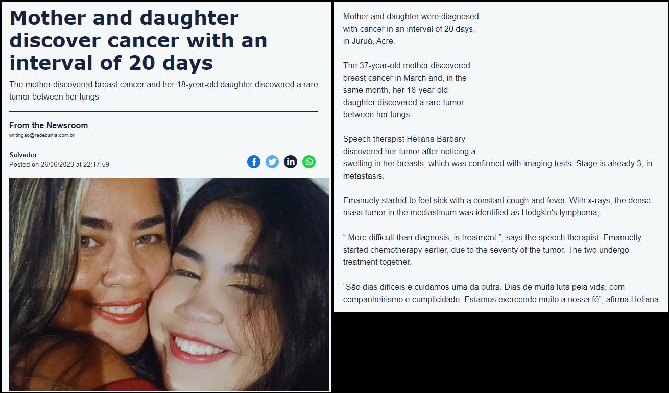 June 26, 2023 - Brazil - 37 year old mother Heliana Barbary was diagnosed with breast cancer in March 2023 and within 20 days her 18 year old daughter Emanuely was diagnosed with a rare Hodgkin’s lymphoma tumor in the lungs (click here)