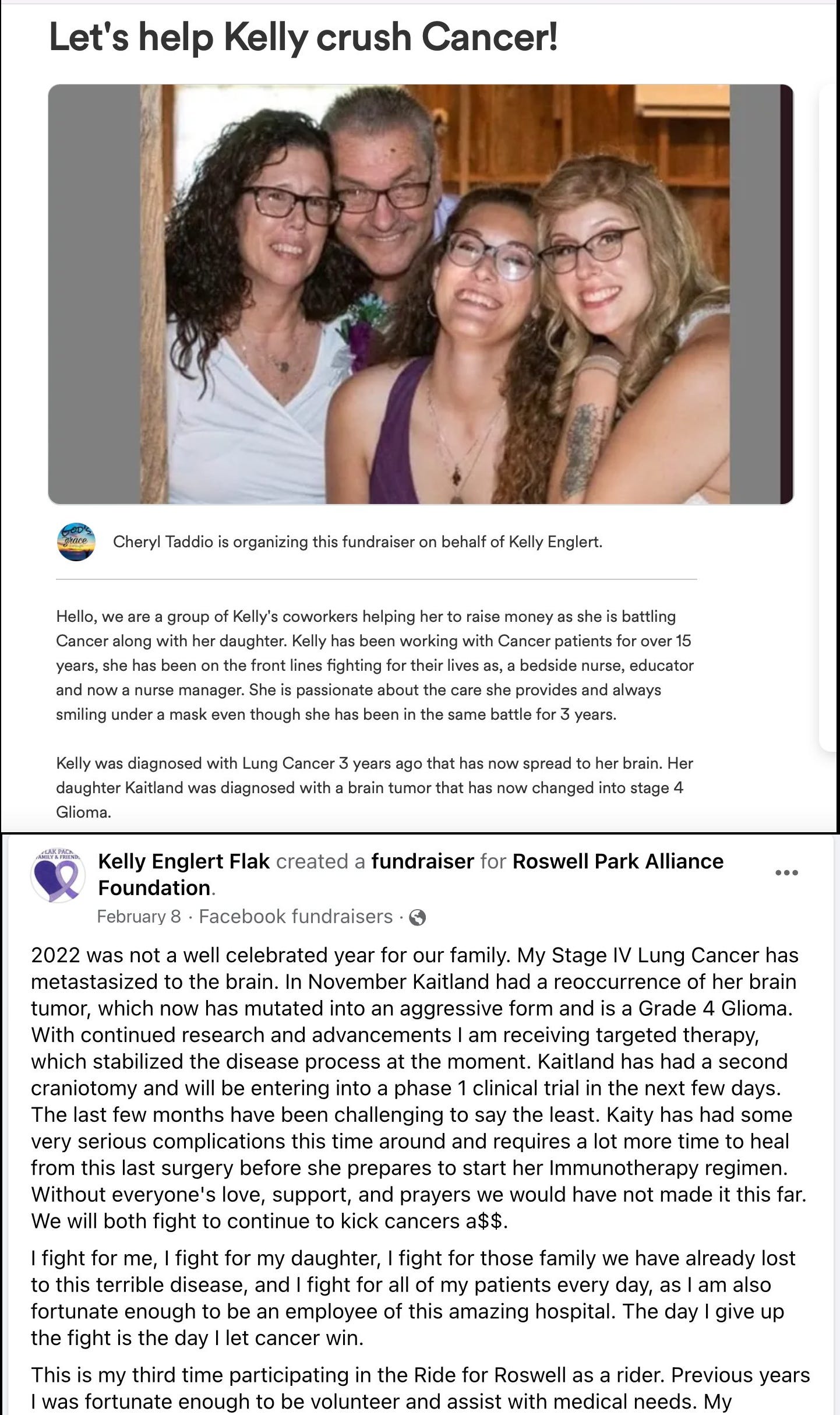 Feb.10, 2023 - Hamburg, NY - Kelly Englert is a nurse who was diagnosed with Stage IV Lung Cancer 3 years ago that has recently spread to her brain. Her daughter Kaitland was just diagnosed with recurrence of her brain tumor which has “mutated into an aggressive form and is a Grade 4 Glioma”. Both have simultaneous CANCER RECURRENCES into more aggressive forms! (click here)