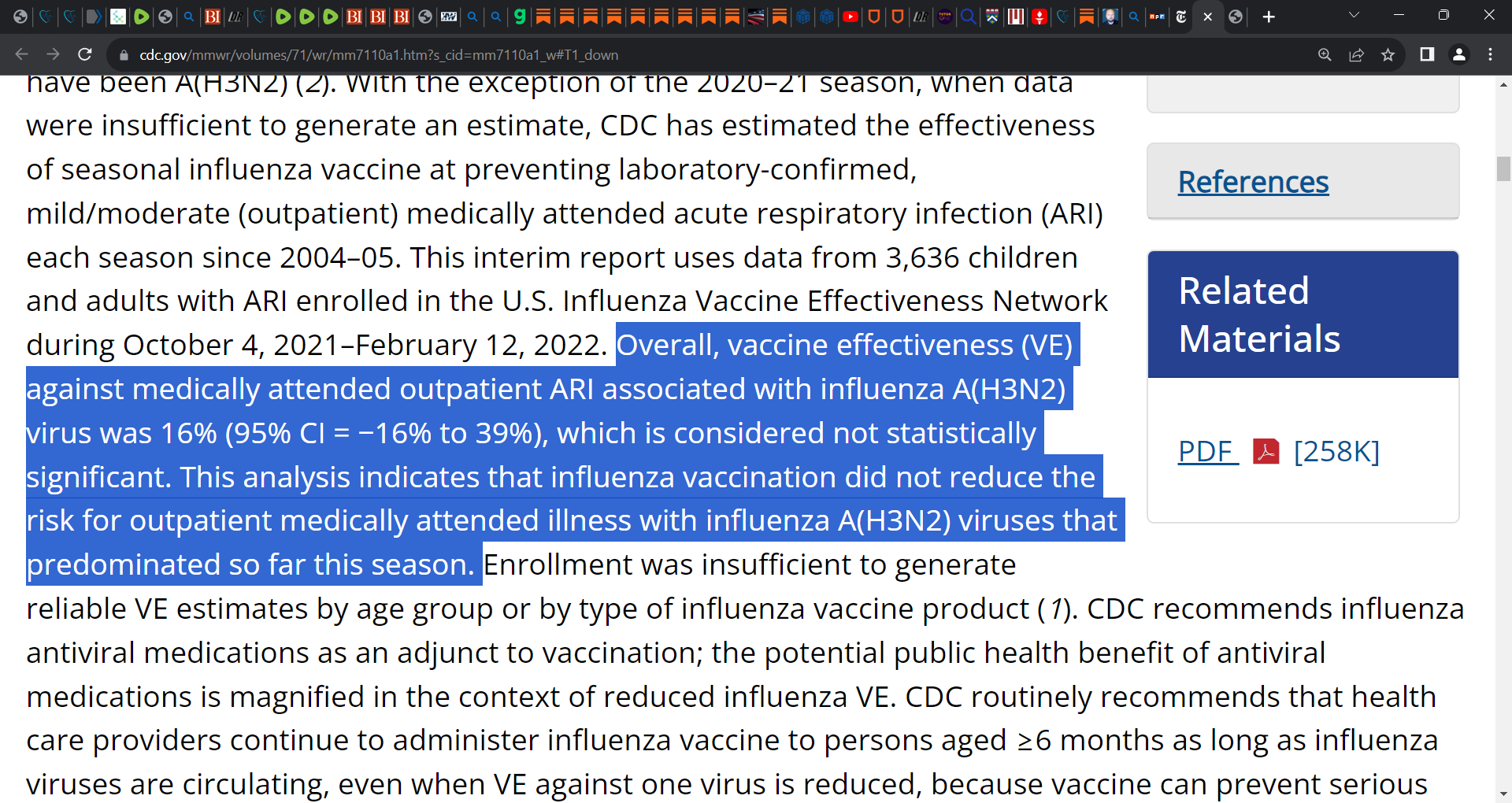 CDC: ‘Overall, vaccine effectiveness (VE) against medically attended outpatient ARI associated with influenza A(H3N2) virus was 16% (95% CI = −16% to 39%), which is considered not statistically significant. This analysis indicates that influenza vaccination did not reduce the risk for outpatient medically attended illness with influenza A(H3N2) viruses that predominated so far this season.’