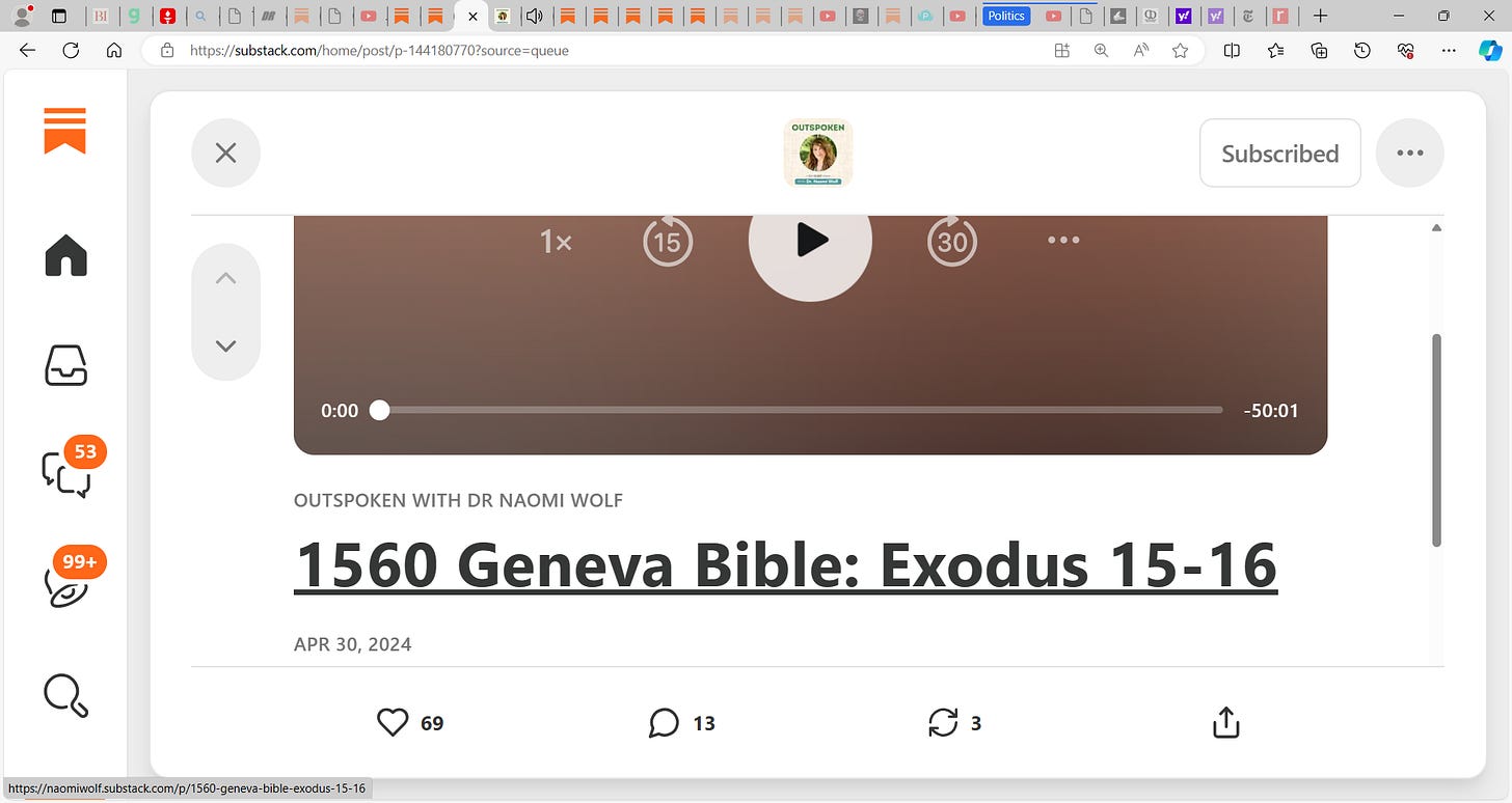 Dr. Naomi Wolf takes the unusual step of reading the 1560 Geneva Bible: Exodus 15-16; I personally appreciated this mindful reading & listening to Dr. Wolf's view & especially the depth of knowledge