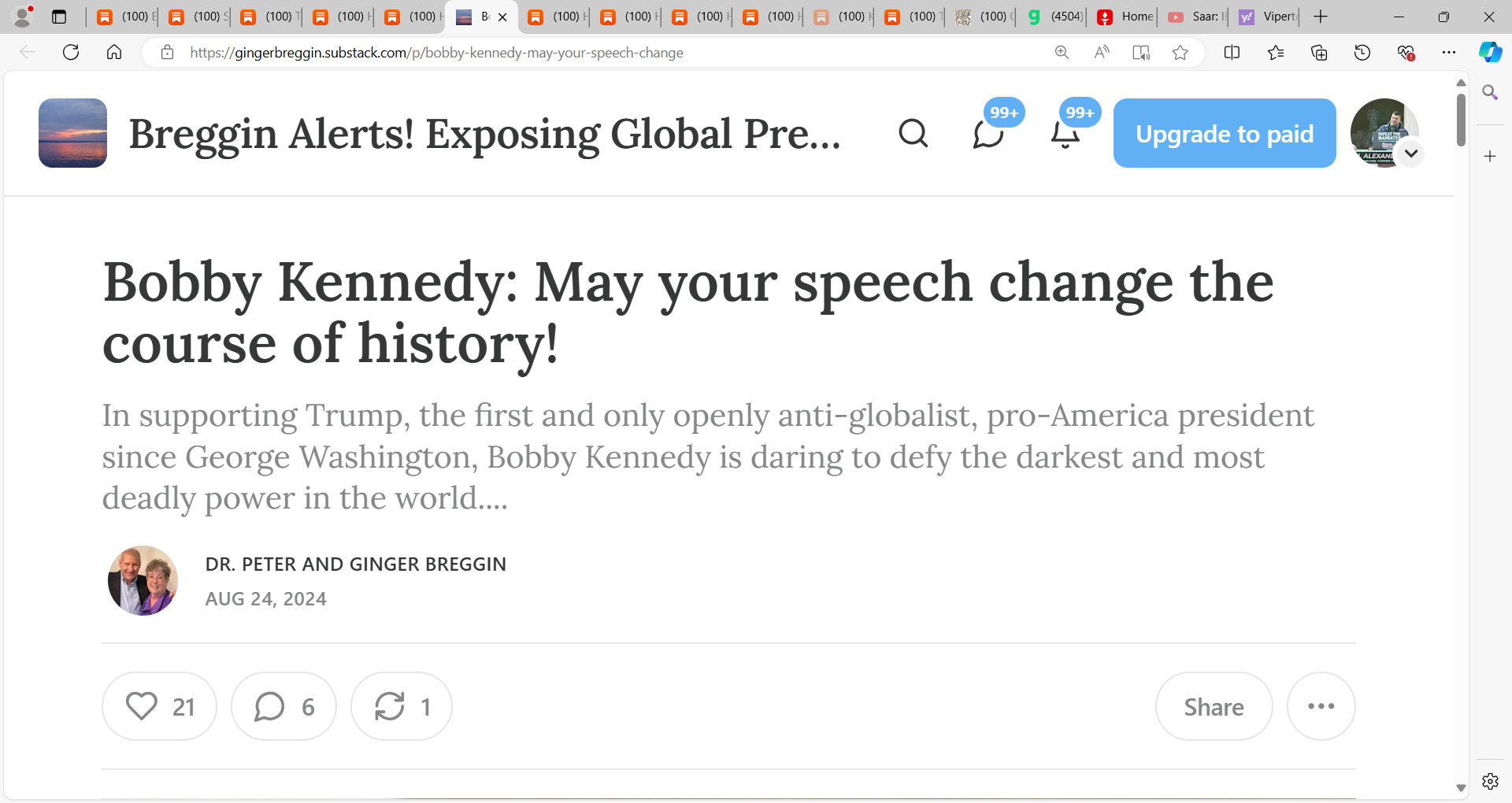 Dr. Peter Breggin & Ginger Breggin (who Robert Malone sued for 25$ million & lost, slapped by the judge) wrote this seminal stack piece: 'Bobby Kennedy: May your speech change the course of history!'