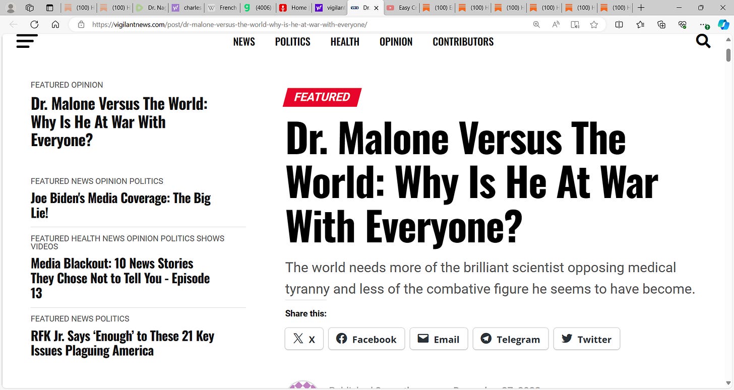 Malone wrote something recently on X or stack that he knows was untrue, grossly untrue about me…caused me lots of threats…yet he wrote it and none of the doctors or scientists with their heads sewn to his ass have the guts to tell him how wrong he was to do that…so to me, all the same…he knows I could sue him, he knows he is exposed but I will await him…what he did was monstrous and he knows it…the freak he is and I will not forgive him…he knows what he did and the depth of sickness he must have in his mind to do that…so the die is cast Malone…word is McCullough will NEVER EVER, till the day the good Lord takes him, ever step foot on a stage where Malone…you must tell the public why Bob…tell them…I agree with McCullough…well, so it is the same with me.